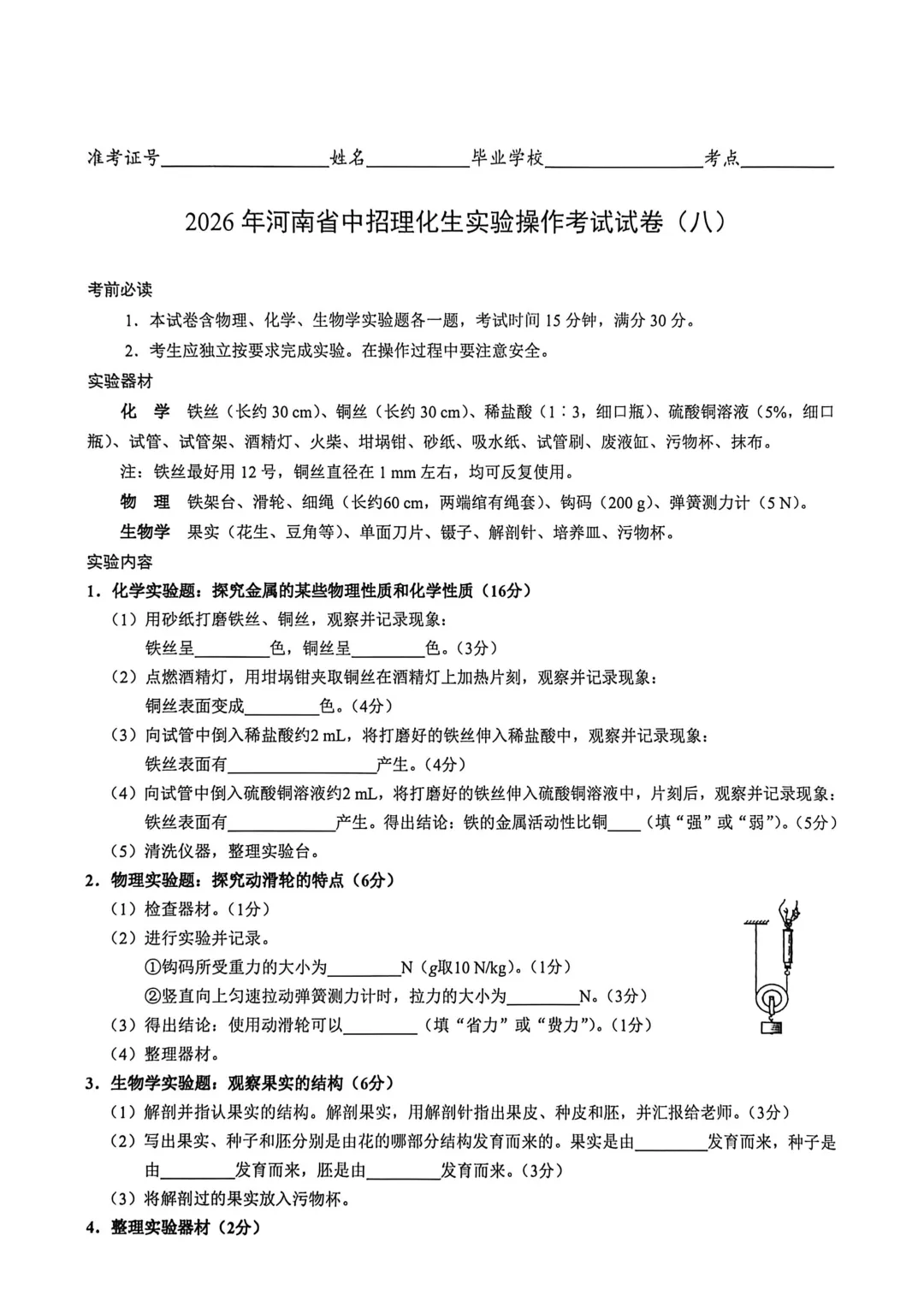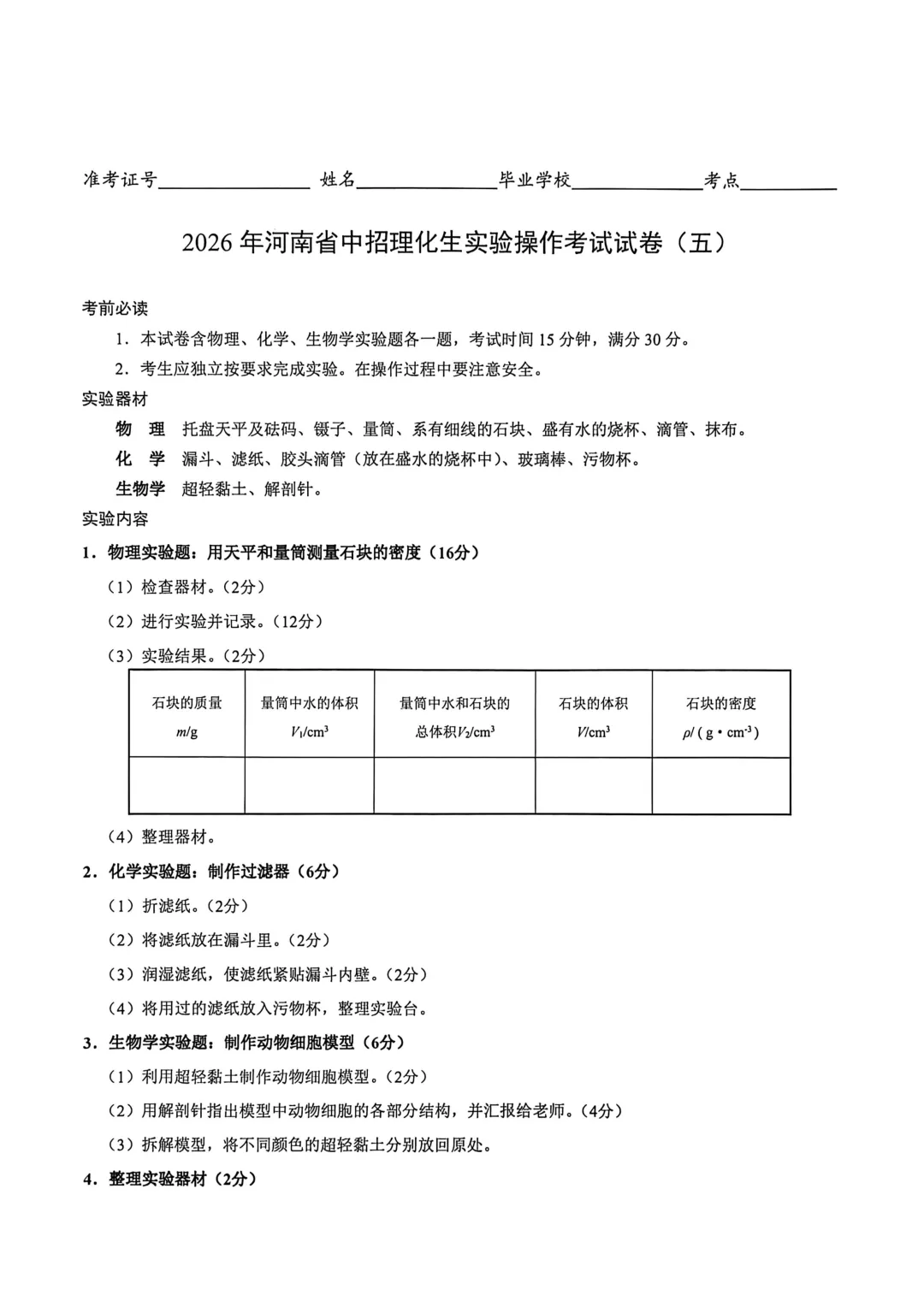 >2026年河南省中招理化生实验操作考试试卷及评分表