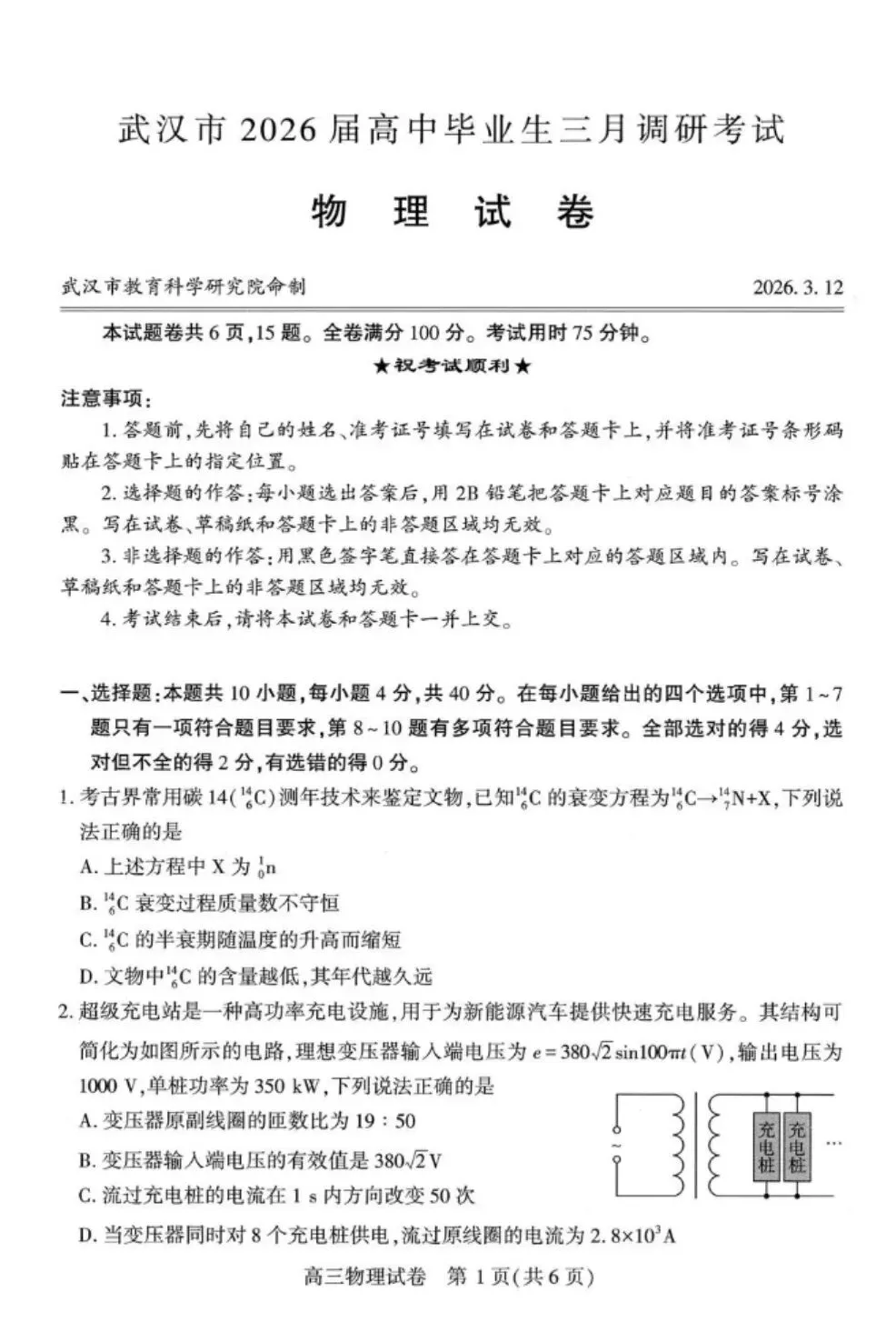 >武汉市2026届高三三月调研考试物理试卷及答案