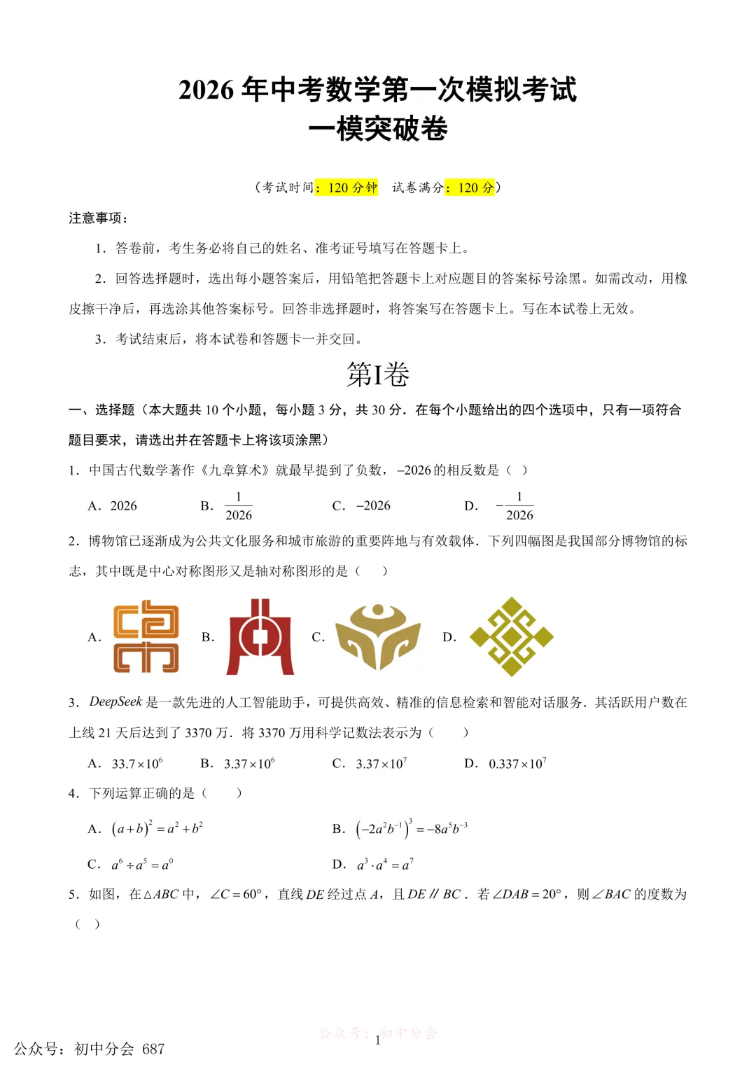 2026年初中学业水平考试数学一模试卷(含答案)
