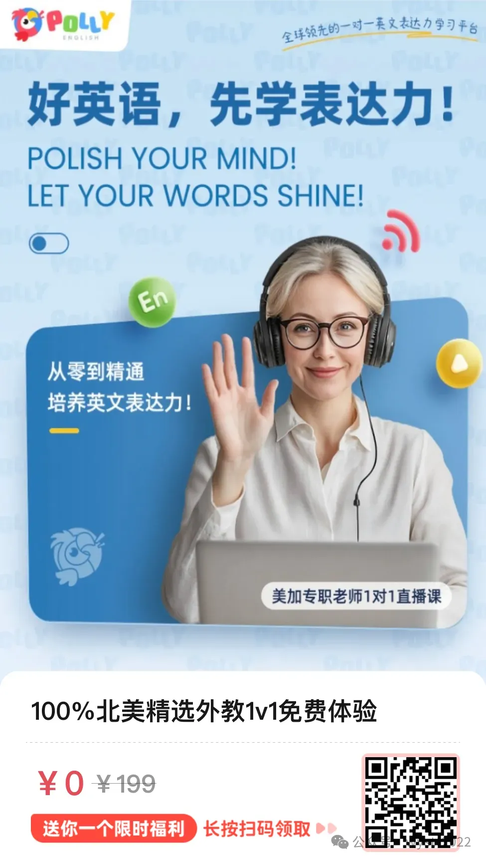 1、性价比之王——菲教1对1 长按识别下方二维码 免费报名体验▼ 2、口语王牌——北美1对1 长按识别下方二维码 免费报名体验▼ 1、报名后会有短信提示上课方式;