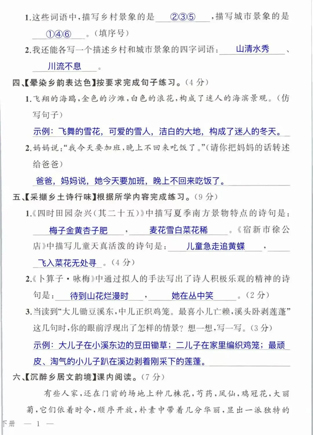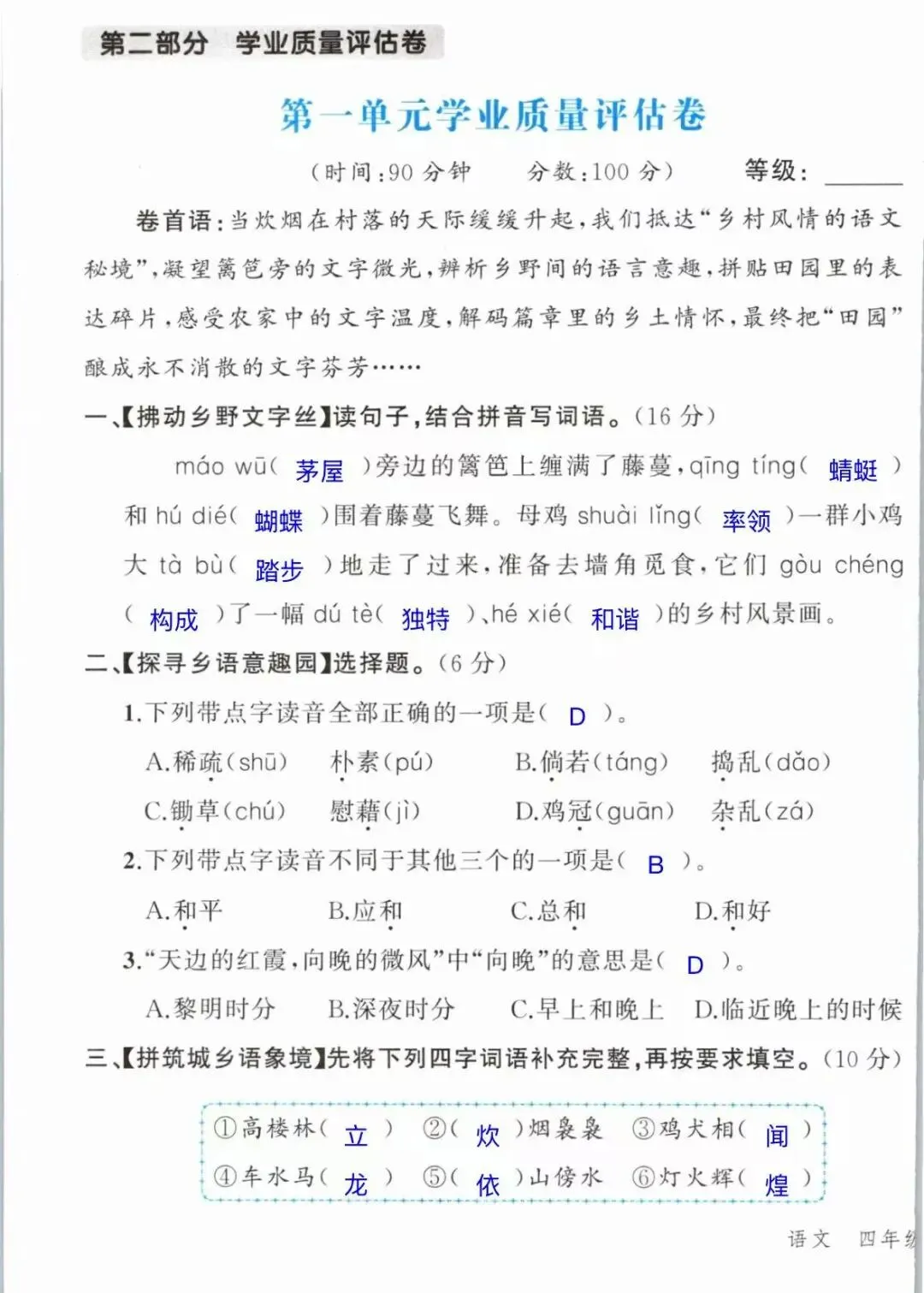 26春先学后练四年级下册语文同步配套试卷!学业质量评估卷(PDF可下载打印)
