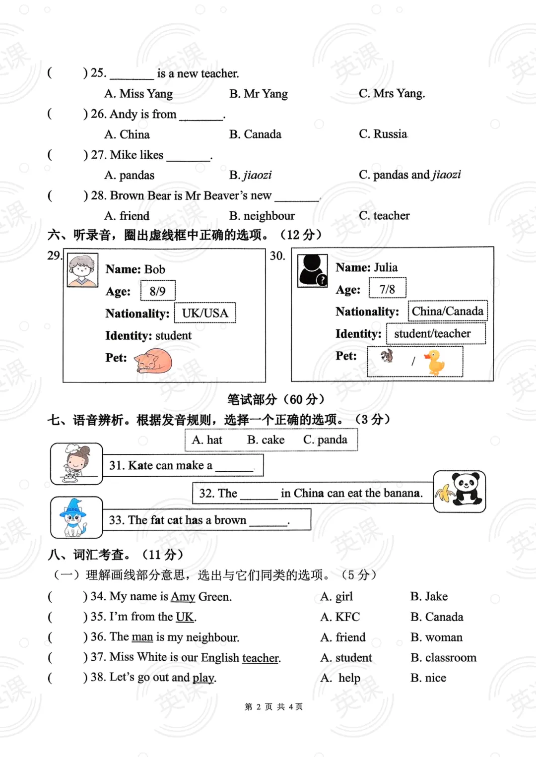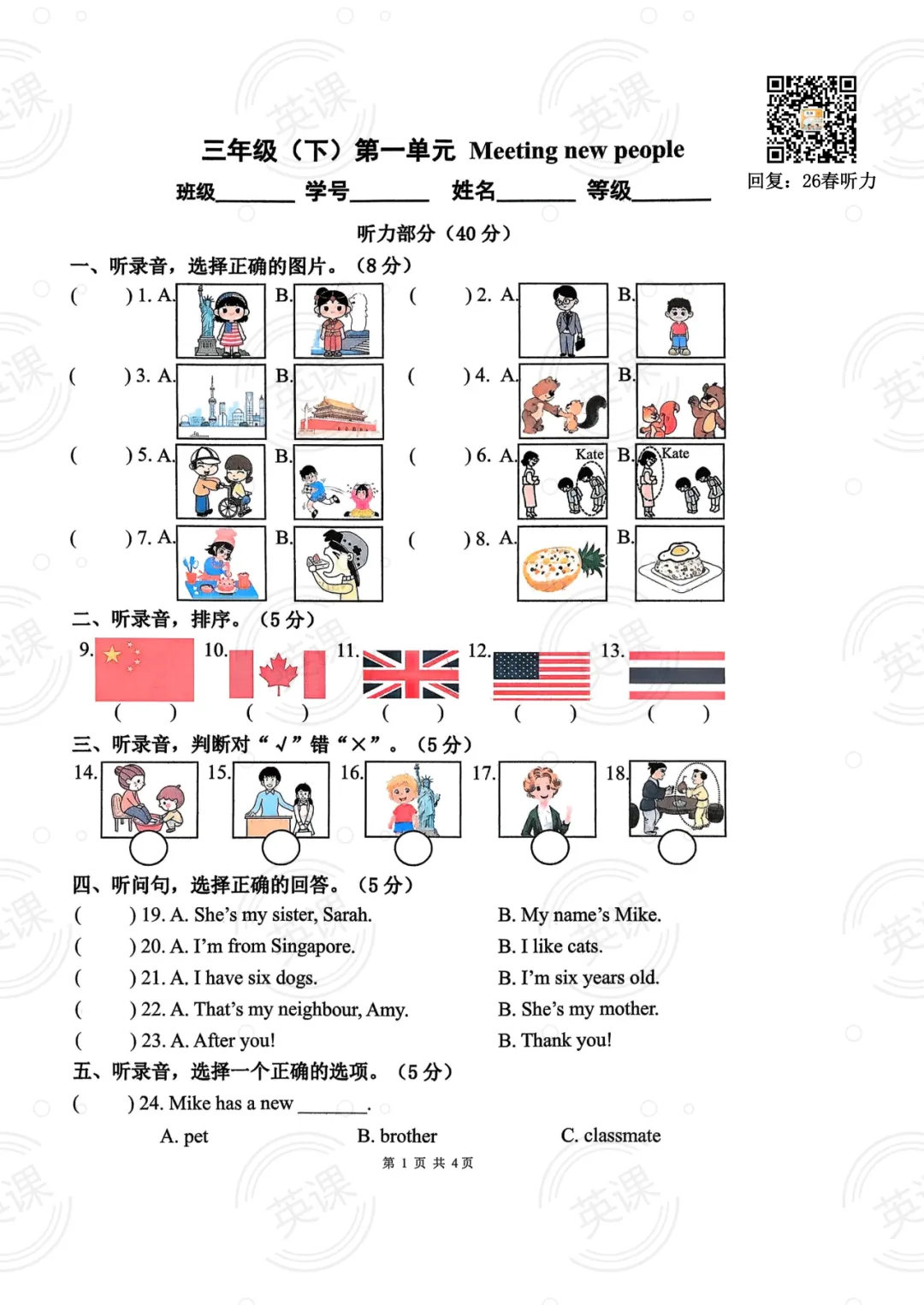 【26春】PEP英语(三下)第一单元试卷