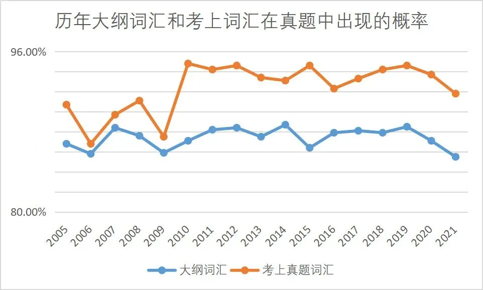 考研大纲词汇在每年真题中出现的比例为87%,考上真题词汇在每年真题中出现的近过95%。