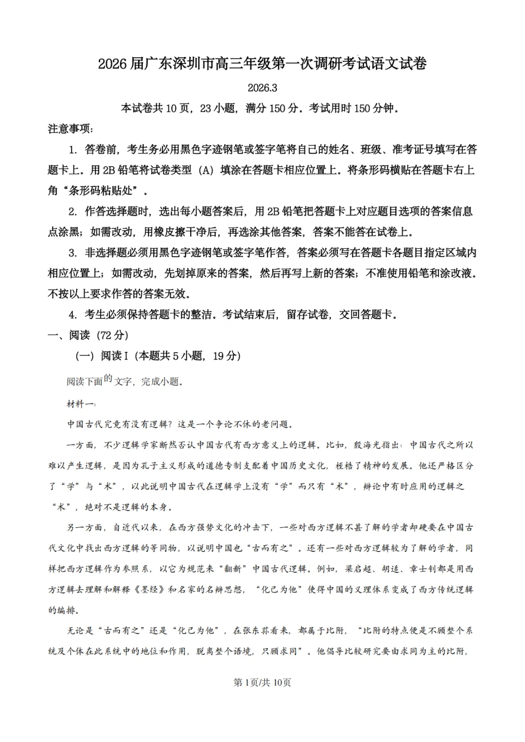 2026年3月深圳一模试卷及答案