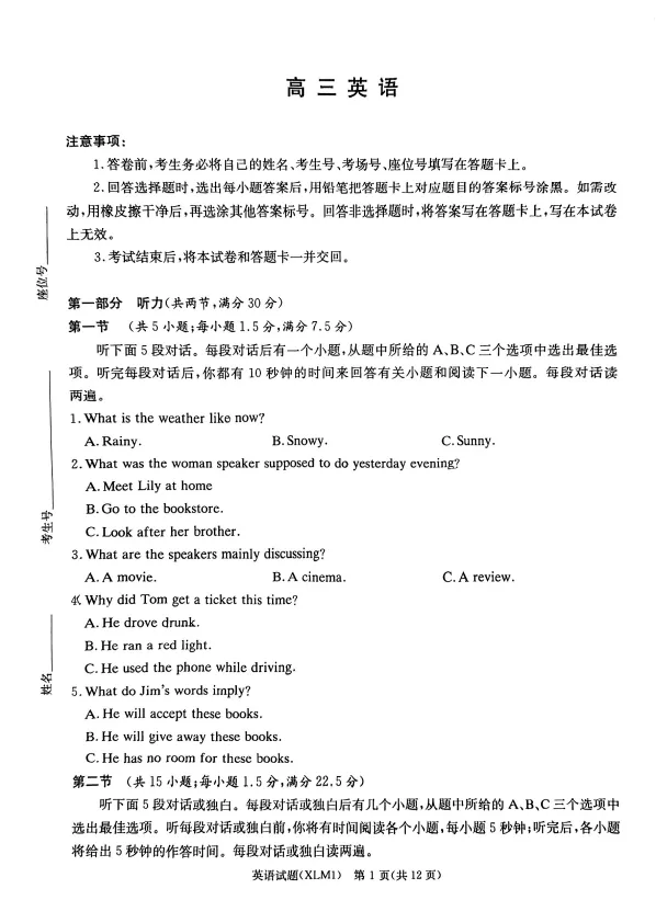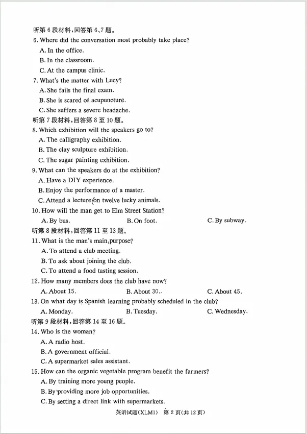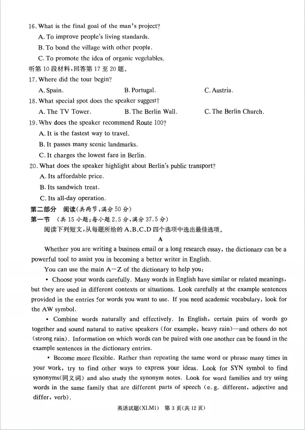 听力理解 | 30 | 中等偏难 | 难点: · 第6题:根据对话内容推断对话发生的地点(如办公室、教室、校医室),需要理解关键词(如“clinic”)。 · 第14题:判断说话人身份(广播主持人、政府官员、超市售货员),需捕捉职业相关用语。 · 第16题:理解项目最终目标,需要把握整体谈话主旨。 · 第18-20题:独白中多个细节(景点、交通工具特点)容易混淆。 易错点: · 听前未预读题干,错过关键信息。 · 对数字、时间等敏感度不够(如第12题:约多少人)。 · 受相似发音或近义词干扰(如第8题:calligraphy, clay sculpture, sugar painting)。 · 忽略说话人的语气、语调所隐含的态度。 |
