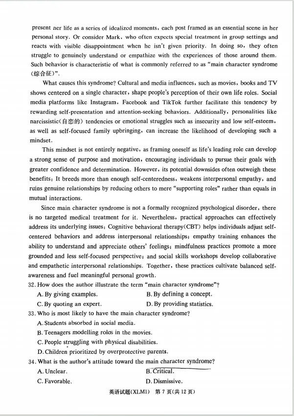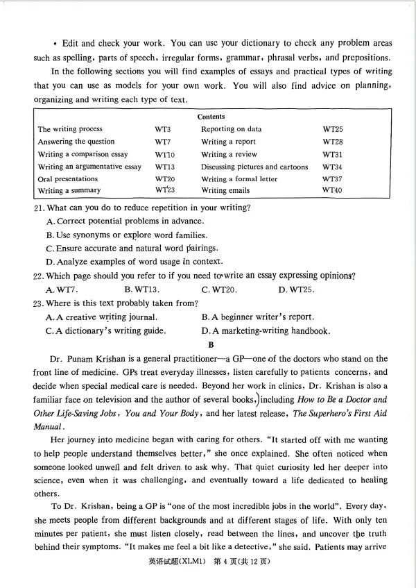 阅读理解 | 37.5 | 中等 | A篇(实用类文本:词典写作指南) · 重点:信息定位、功能匹配(如“减少重复”对应“用同义词”)。 · 难点:区分不同写作建议的适用场景。 · 易错点:题干关键词(如“reduce repetition”)未找准对应段落。 B篇(人物传记:医生Punam Krishan) · 重点:人物动机、职业特点、价值观理解。 · 难点:第25题“为什么深入科学?”需要从“好奇心”和“观察他人”中推理。 · 易错点:过度推断(如第27题哲理归纳,需紧扣“预防”思想)。 C篇(科普说明文:蚂蚁与交通) · 重点:因果关系、实验结论、词义猜测。 · 难点:第28题“直接原因”需理解“density + sudden brake”共同作用。 · 易错点:词义题“tailgating”脱离上下文,误选“保持距离”。 D篇(心理类文章:“主角综合征”) · 重点:举例说明、成因分析、态度判断。 · 难点:第32题“如何阐述术语”——通过举例。 · 易错点:第33题“最可能患主角综合征的人”需综合成因(媒体、家庭教养)。 |