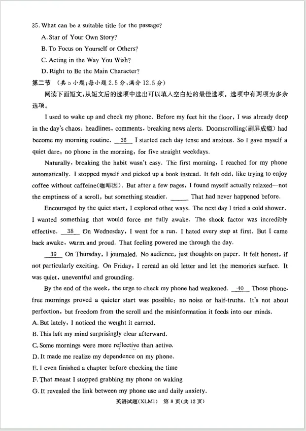 七选五 | 12.5 | 中等 | · 重点:语篇逻辑连贯性(因果、转折、递进)、代词指代、段落主旨匹配。 · 难点:第36、37、40题需结合上下文情感变化和动作顺序。 · 易错点:忽视段落间的过渡句(如第39题承上启下)。 · 注意事项:先通读全文,抓首尾句;注意选项中的代词(it, that, this)和逻辑词(but, so, then)。 |
