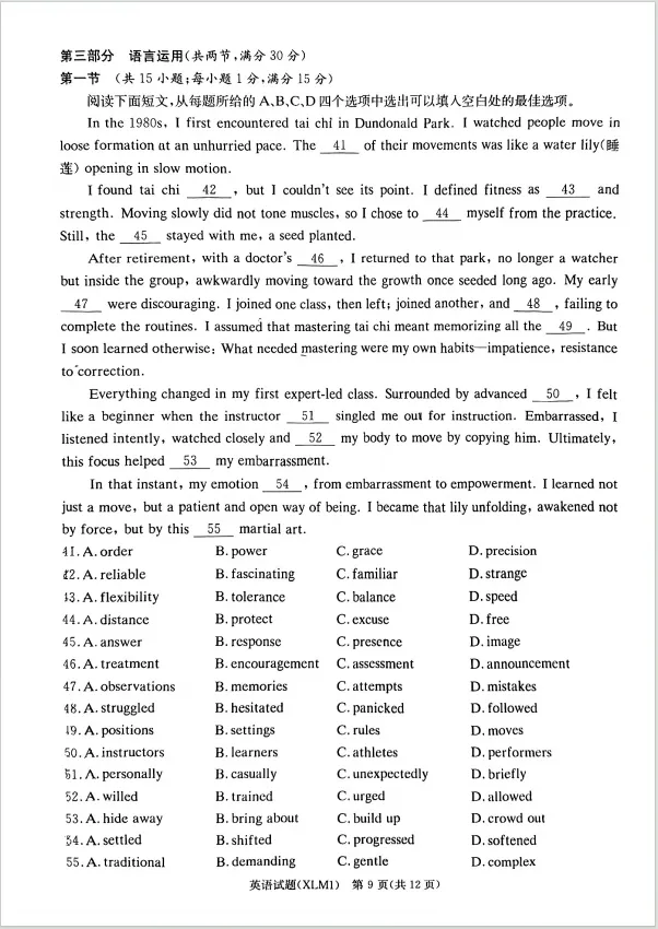 完形填空 | 15 | 中等 | · 重点:上下文语境理解、词汇辨析、情感变化线索。 · 难点:第41题“grace”需结合比喻“睡莲绽放”选出优雅;第55题“gentle”呼应开头。 · 易错点:脱离语境选词(如第44题“distance”误选“protect”);忽略情感转折(第54题“shifted”)。 · 注意事项:先通读全文,把握故事脉络和情感基调;选项代入后检查逻辑是否通顺。 |