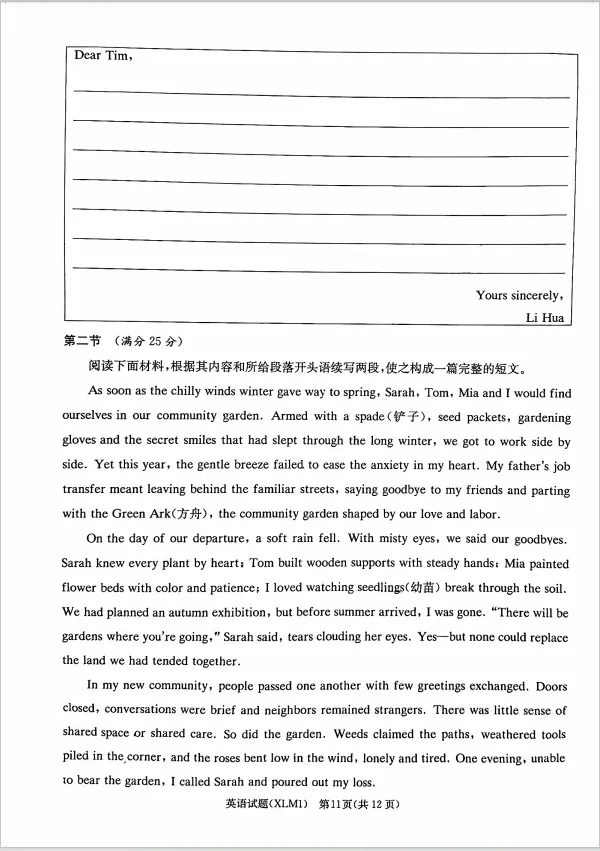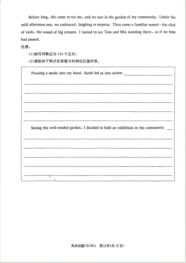 读后续写 | 25 | 中等偏上 | · 重点:情节合理延续(朋友到来后一起整理花园→举办展览)、情感呼应(从失落→温暖)、语言风格一致。 · 难点:衔接所给段落开头(第一段写劳动过程,第二段写展览决定及影响)。 · 易错点:情节偏离原文(如突然引入新人物);语言平淡,缺乏细节描写。 · 注意事项:第一段应描写共同劳动的场景,融入人物互动和情感;第二段突出展览的意义(社区融合、友谊)。多用动作描写、环境烘托。 |