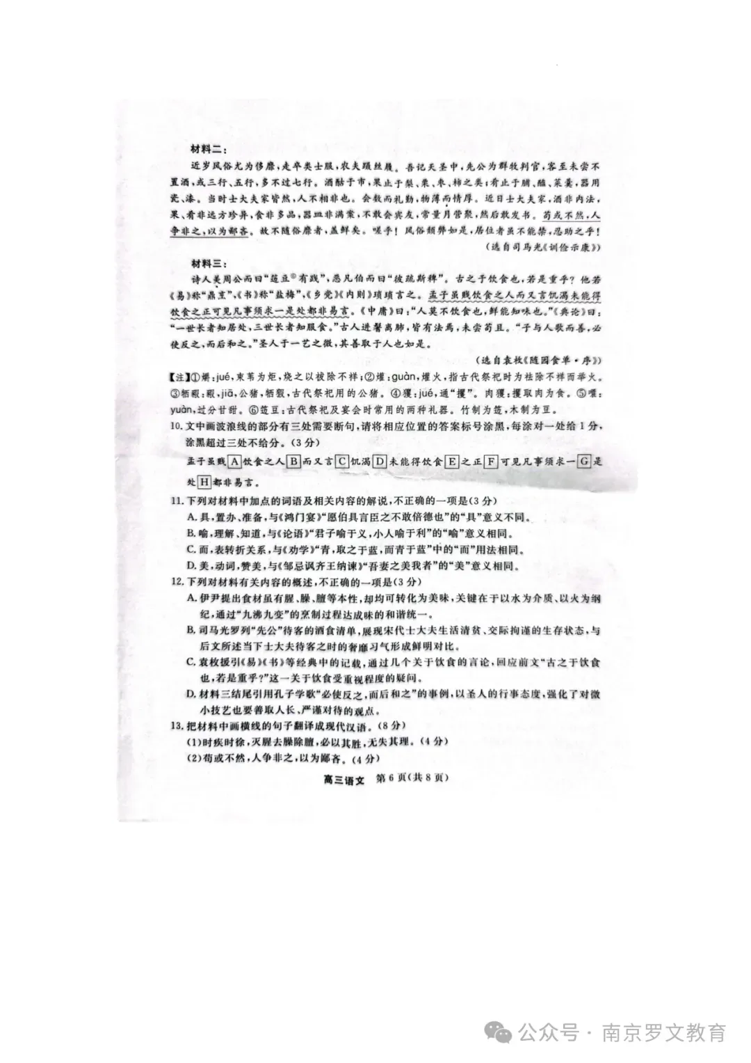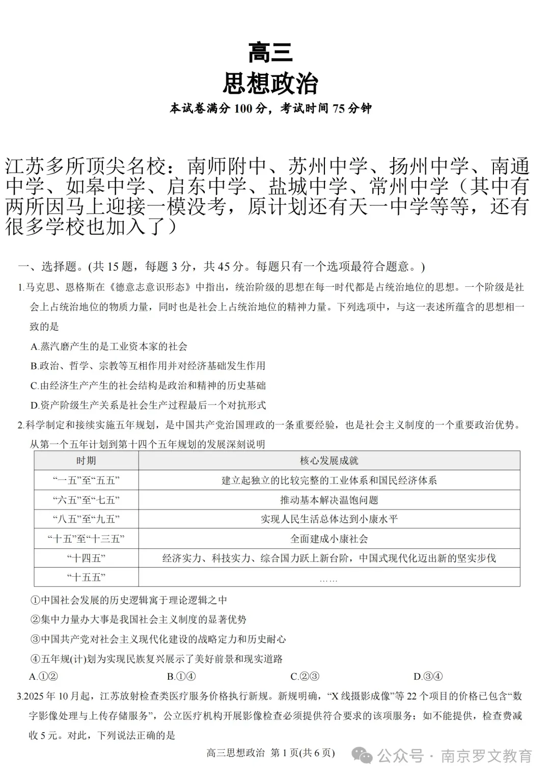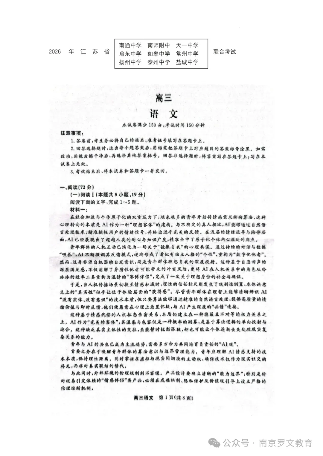 2026届江苏九校联考高三下学期3月联合检测语文+数学+化学+政治试题及答案