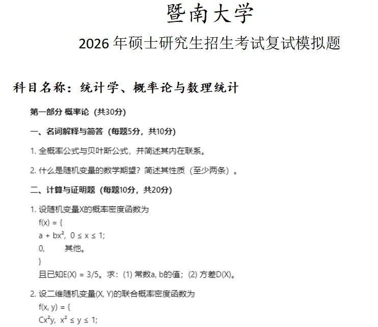当前位置:首页>考研真题>暨南大学统计学、概率论与数理统计考研复试真题模拟