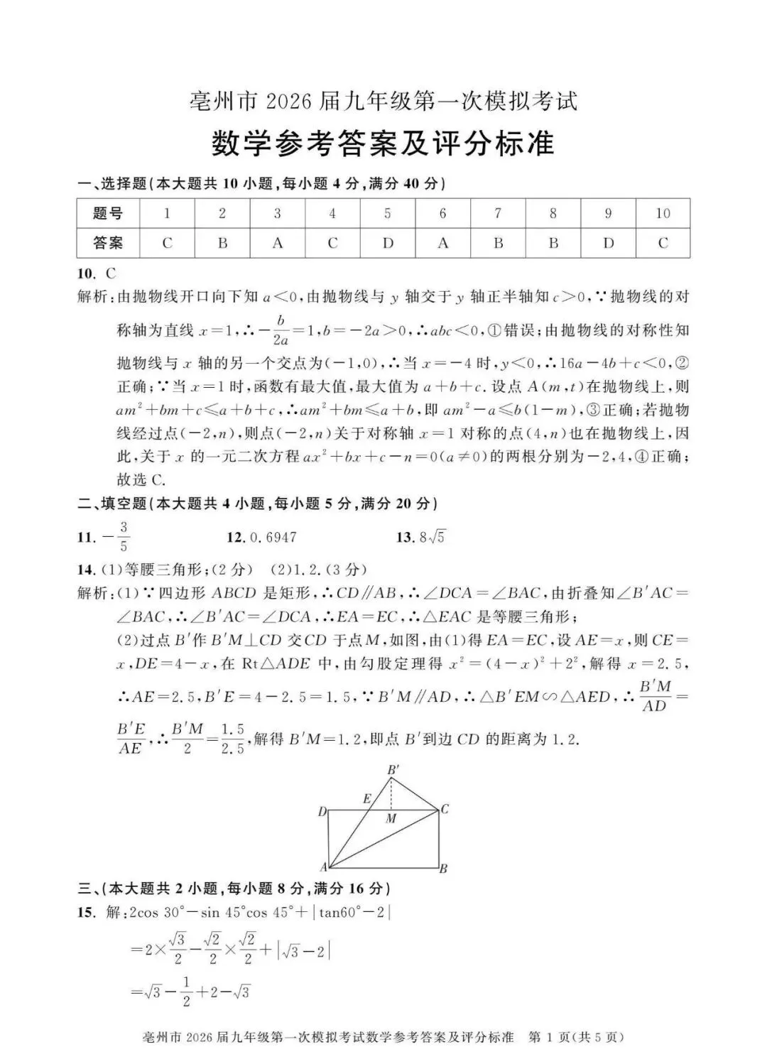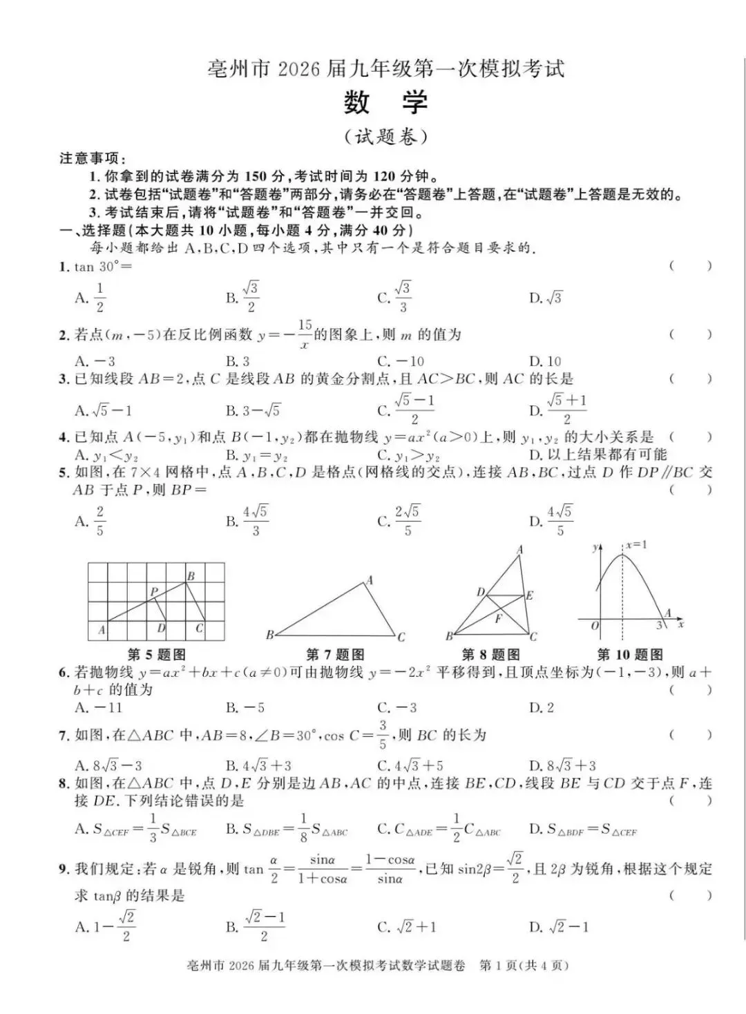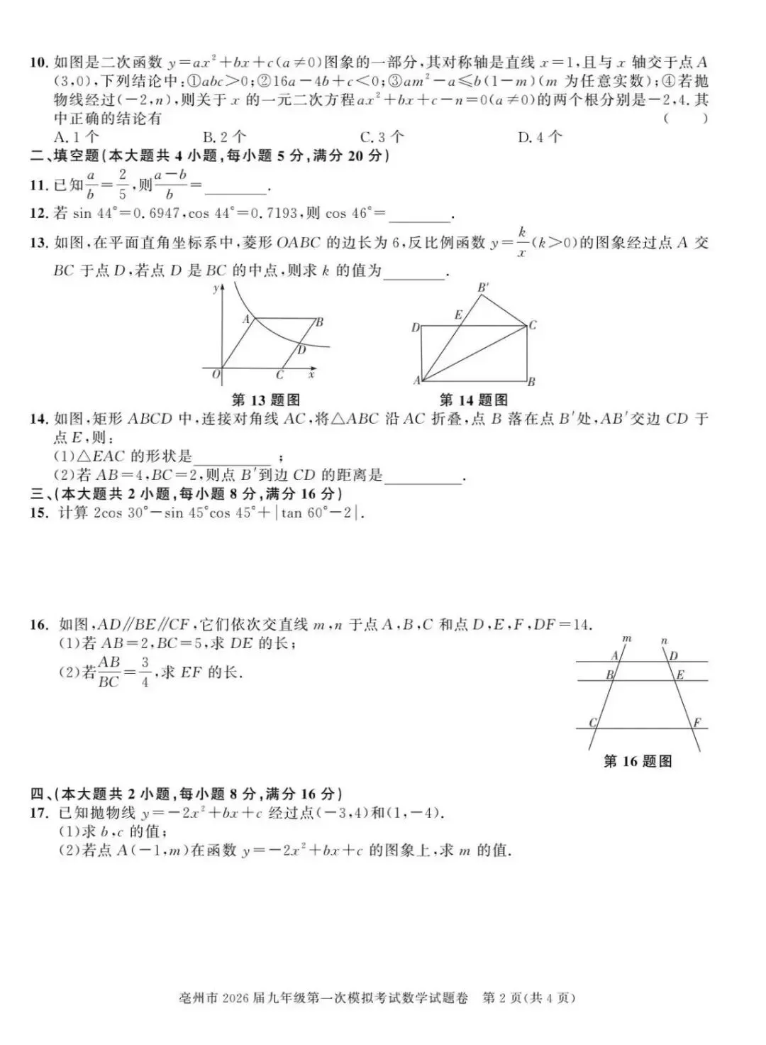 【安徽亳州】2026九年级数学一模试卷+答案