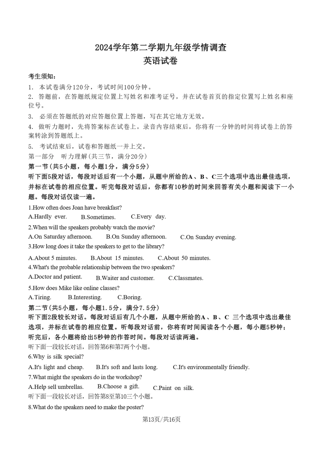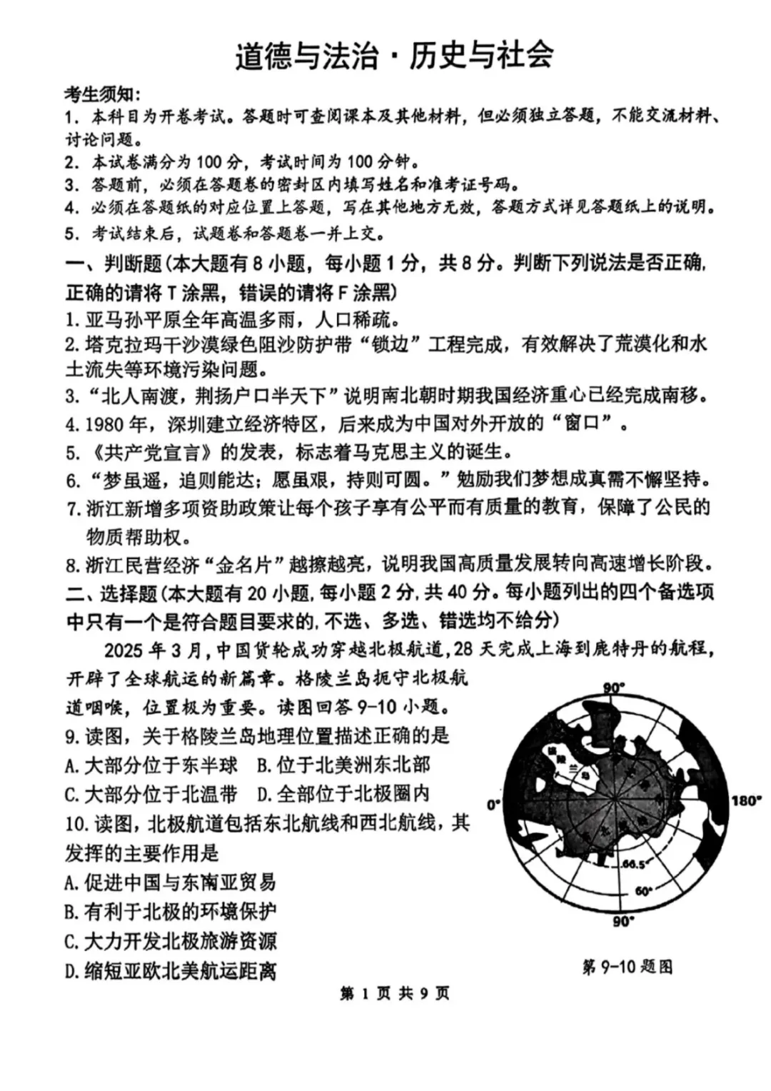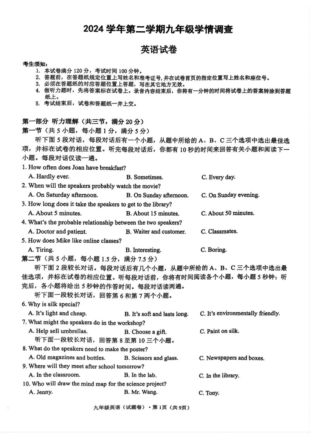 >中考一模|2025年4月上城区模考试卷+答案(内含下载链接)