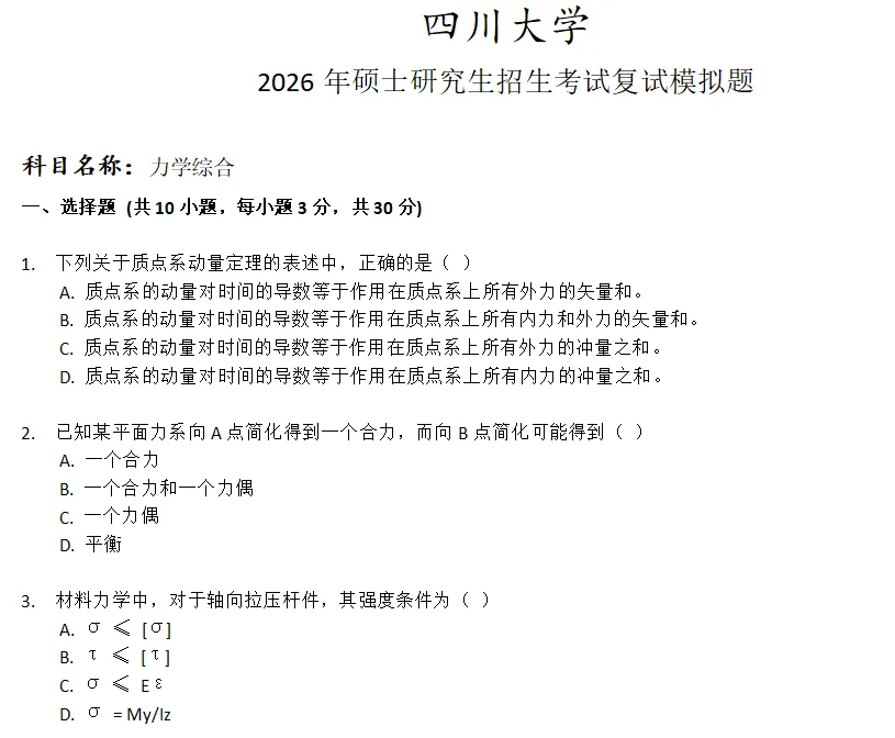 四川大学力学综合考研复试真题模拟