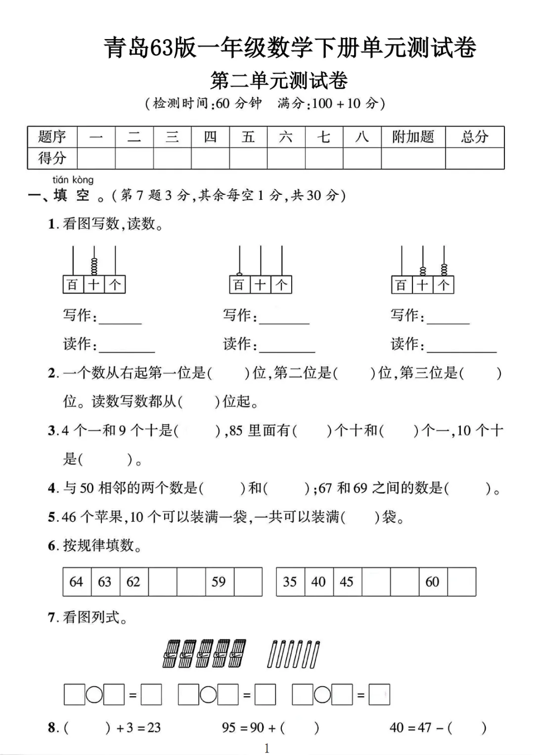 【免费下载】一年级下数学第二单元拔尖测试卷《青岛63版》,PDF电子版,共8页,可打印