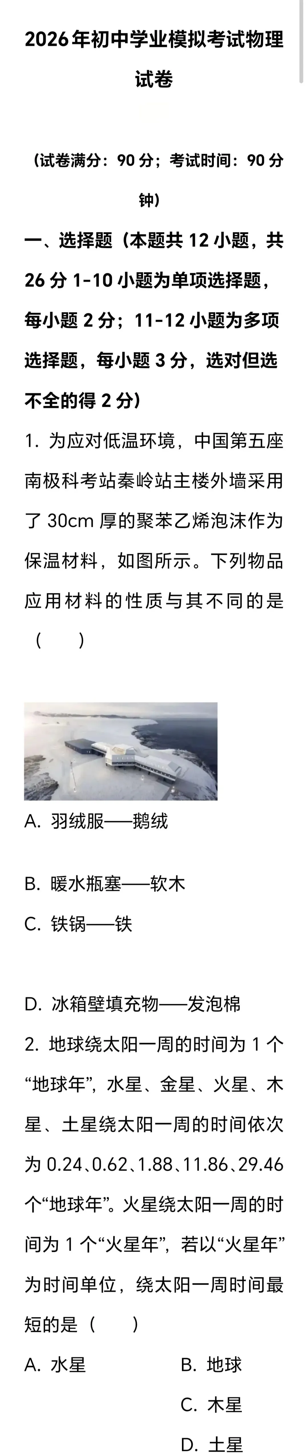 >2026年初中学业模拟考试物理试卷
