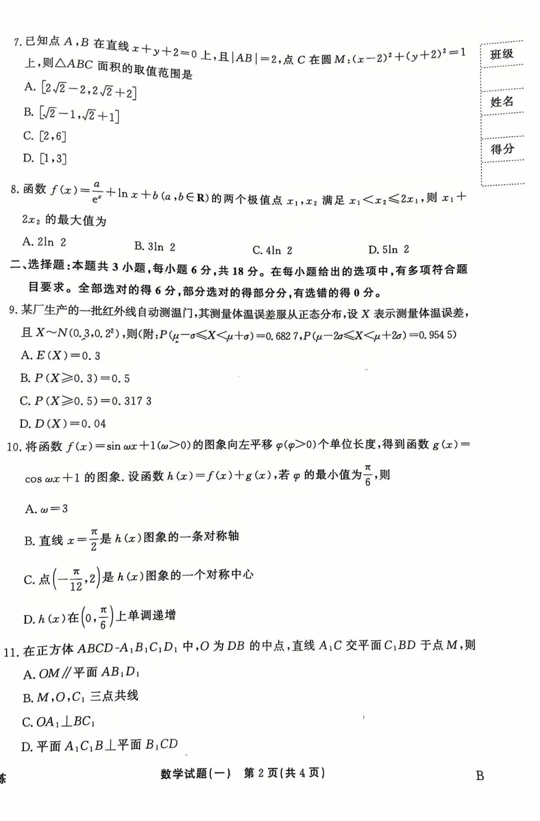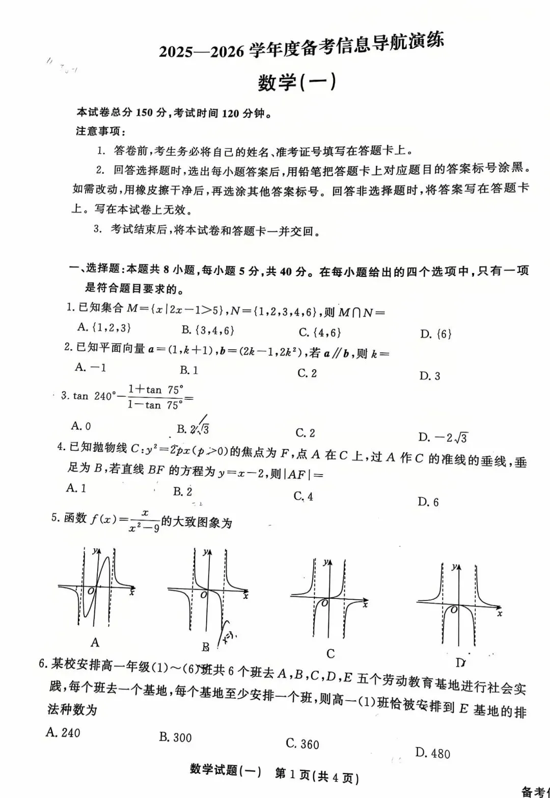 2. 中档题:三角函数化简、抛物线性质、函数图像判断、排列组合、立体几何多选等,需知识综合应用,侧重解题方法与逻辑,区分中等水平考生;