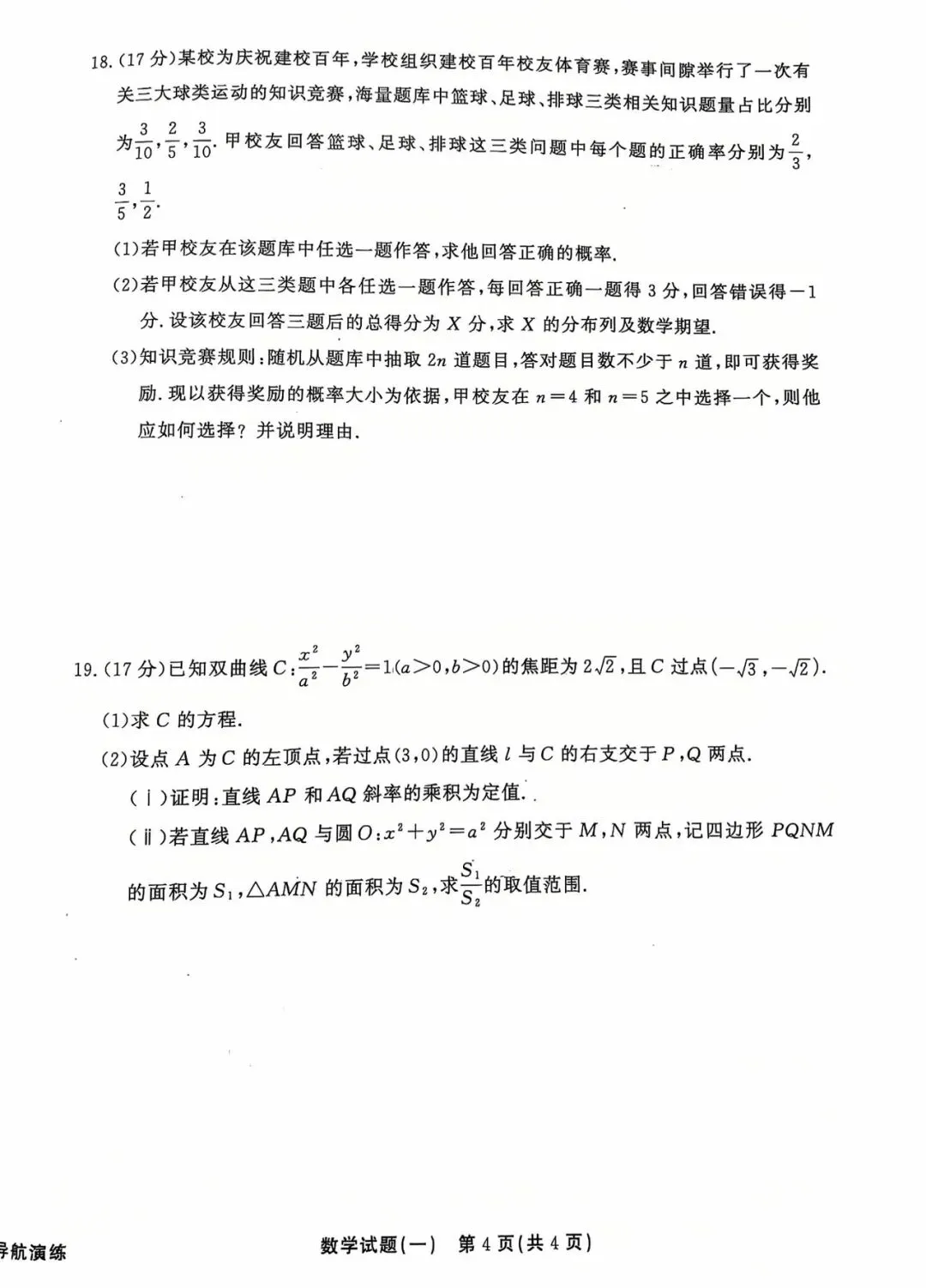 3. 难题:函数极值点综合、双曲线面积范围、概率压轴问,考查思维深度与知识迁移能力,是拔高区分的关键,对考生综合能力要求高。