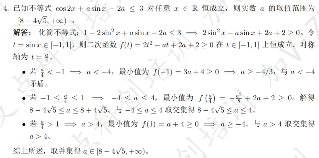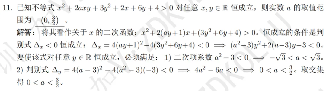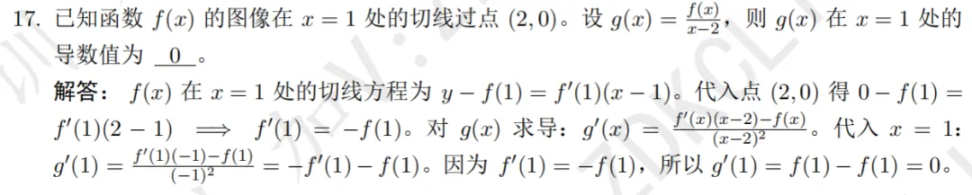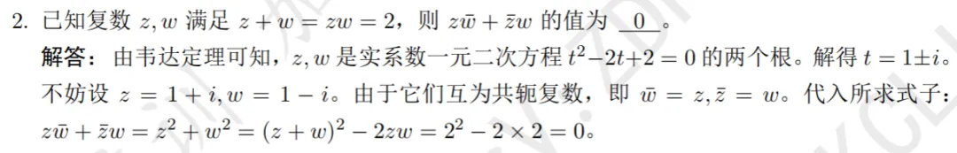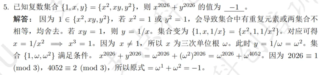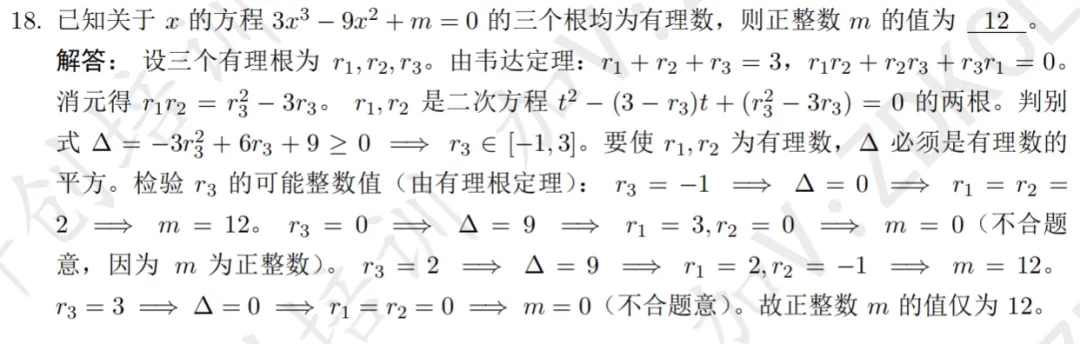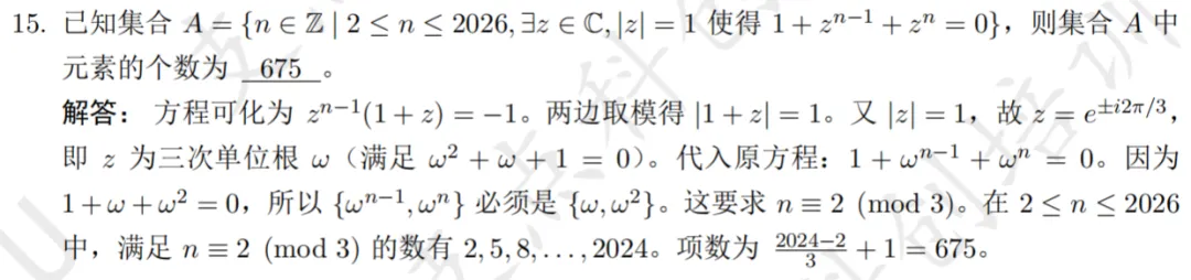 2026年中科大少创班入围考试数学试卷及解析现已发布,欢迎同学们查阅参考~本次入围考试数学试卷总计 20 道填空题,考查内容以高中数学为主,辅以少量联赛一试题目,全面考察考生的数学基础与核心素养。考察知识点:集合性质、单位根本题需注意到集合元素互异性,根据三次单位根的幂周期性求解考察知识点:函数与方程、利用导数分析函数的单调性和极值本题参变分离后求导分析单调性,画出函数图象即可得到参数范围考察知识点:数学期望、几何概型本题需要构造指示变量,根据几何概型求得概率,进而求期望考察知识点:二次不等式恒成立本题依次将不等式视为关于x,y的二次函数恒成立,根据判别式得到参数范围考察知识点:换元法、解高次不等式本题对根式换元,得到y的四次不等式,因式分解即可得解集考察知识点:复数方程,三次单位根本题涉及复数方程求解及三次单位根,根据余数判断n的取值考察知识点:数列求和、分组求和本题根据等差数列求和,生成新数列,分组后根据公式得到结果考察知识点:三次方程韦达定理、有理根定理本题根据三次方程韦达定理得到三根关系,由有理根定理即可得到m取值考察知识点:环形染色问题本题为标准形式的环形染色,根据递推关系即可求得通项