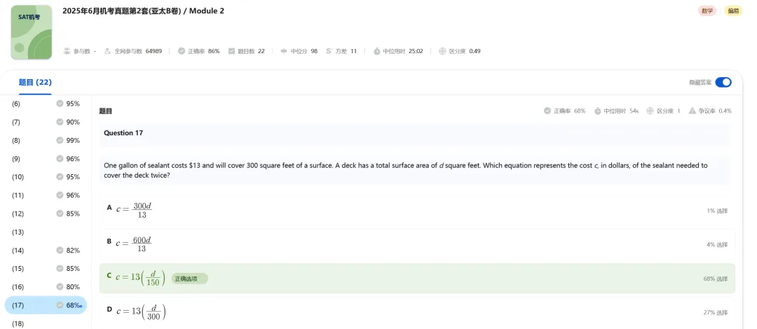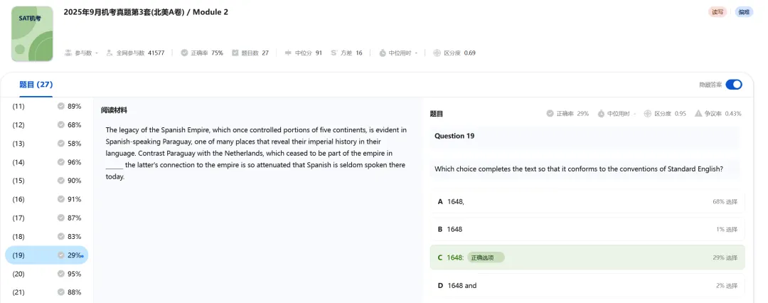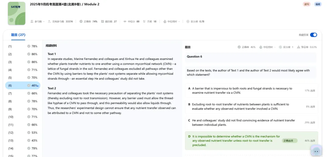 M1比较容易,我一个在韩国考试的同学说,“我M1从来没这么快过,我剩了快8分钟”。M2的难度较高,但难度不及25年8月的考试。尽管有同学表示M2比较友好,但可能只是个例,从趋势来看,26年的SAT阅读难度依然会保持上升