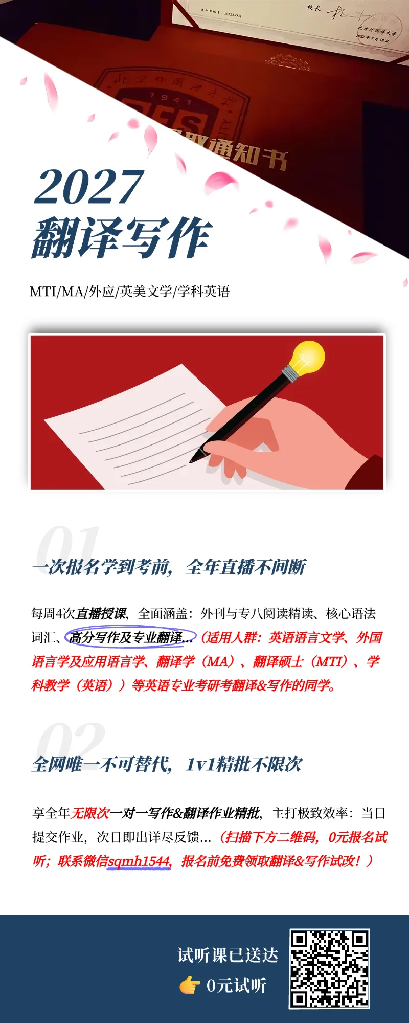 给大家推荐:水清开设五年的翻写班,今年2026准备出发(明日上线,大家可以关注)!适配以上❶❷全部考试内容,无论你是准备考英语语言文学、外国语言学及应用语言学、翻译学(MA)、翻译硕士(MTI)、学科教学(英语),均可以报名。