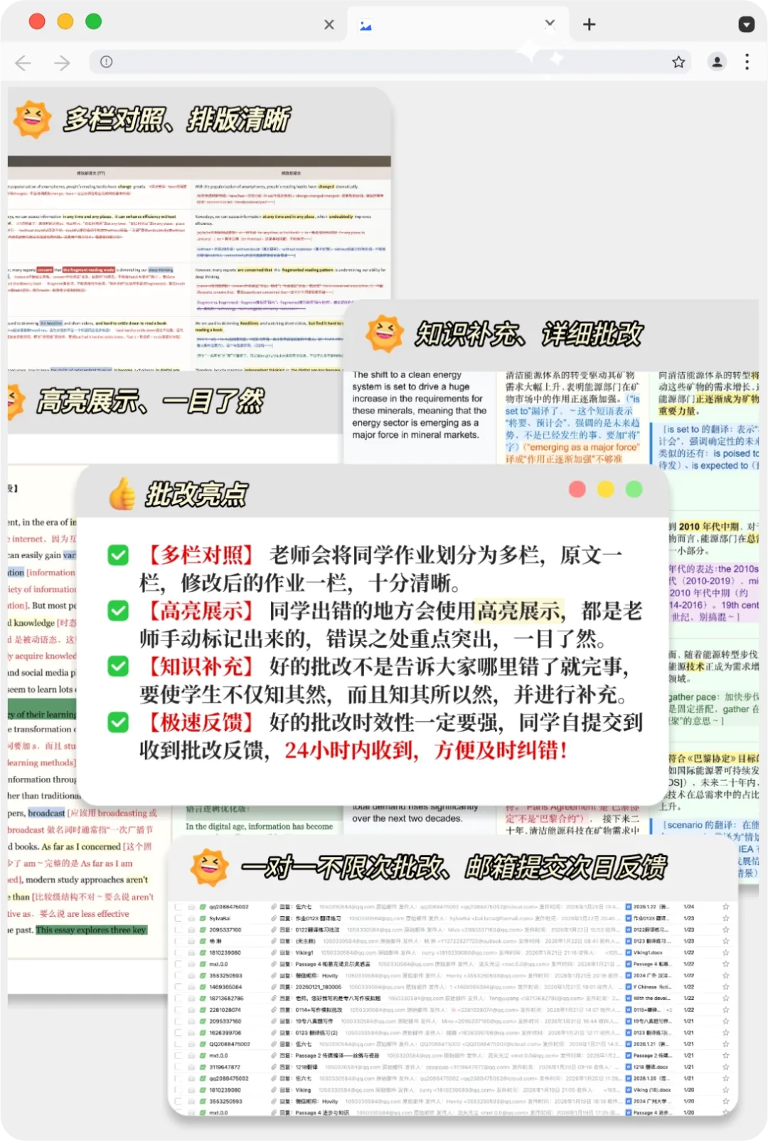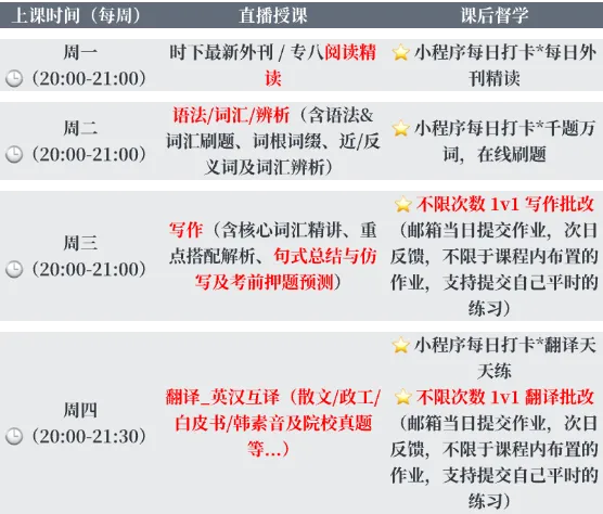 ❷ 全程批改督学:本年度翻写班主打:不限次数1v1批改。翻译和写作均支持单独报名,翻译写作报名有优惠,且赠送语法/词汇/阅读课!