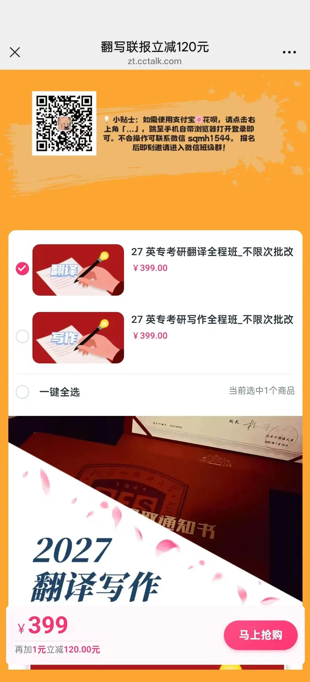 翻译&写作均支持单独报名,3.21日开课前报名享受立减优惠:翻写联报立减120元,到手仅需678(录取吧,好寓意,一战成硕)请前往联报页面参与~