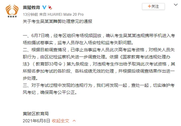 6月8日,武汉市黄陂区教育局官方微博发布关于考生吴某某舞弊处理意见的通报: