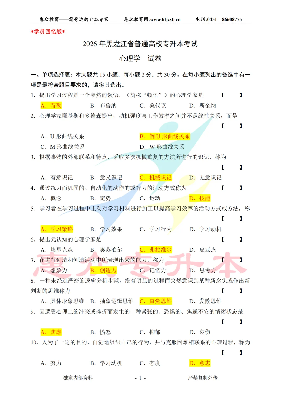 >【心理学】2026年统招专升本考试真题(学生回忆版)