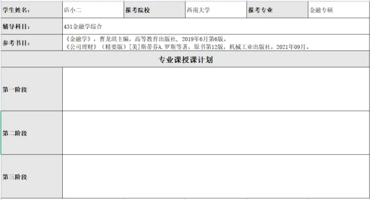 第一:研究生授课安排表。对接以后,对于学员上课有全局性和阶段性规划。什么阶段要完成什么内容,要用多少课时,以及达到什么效果。此表由研究生填写,我们和考生共同审核。