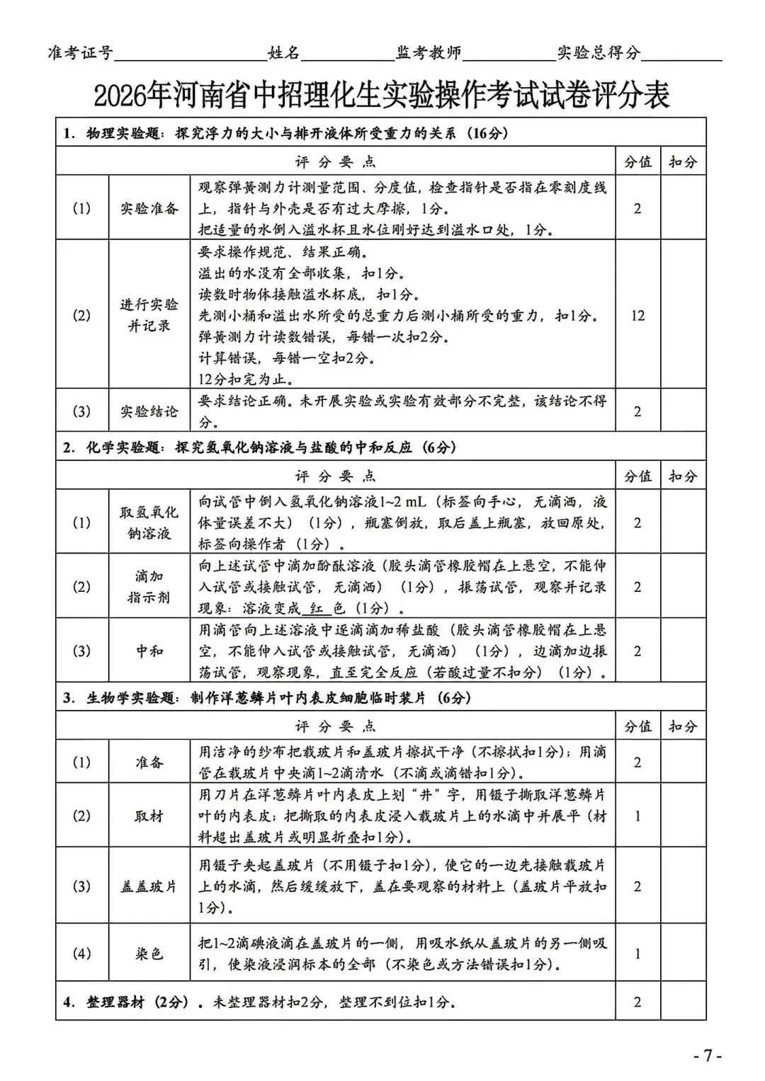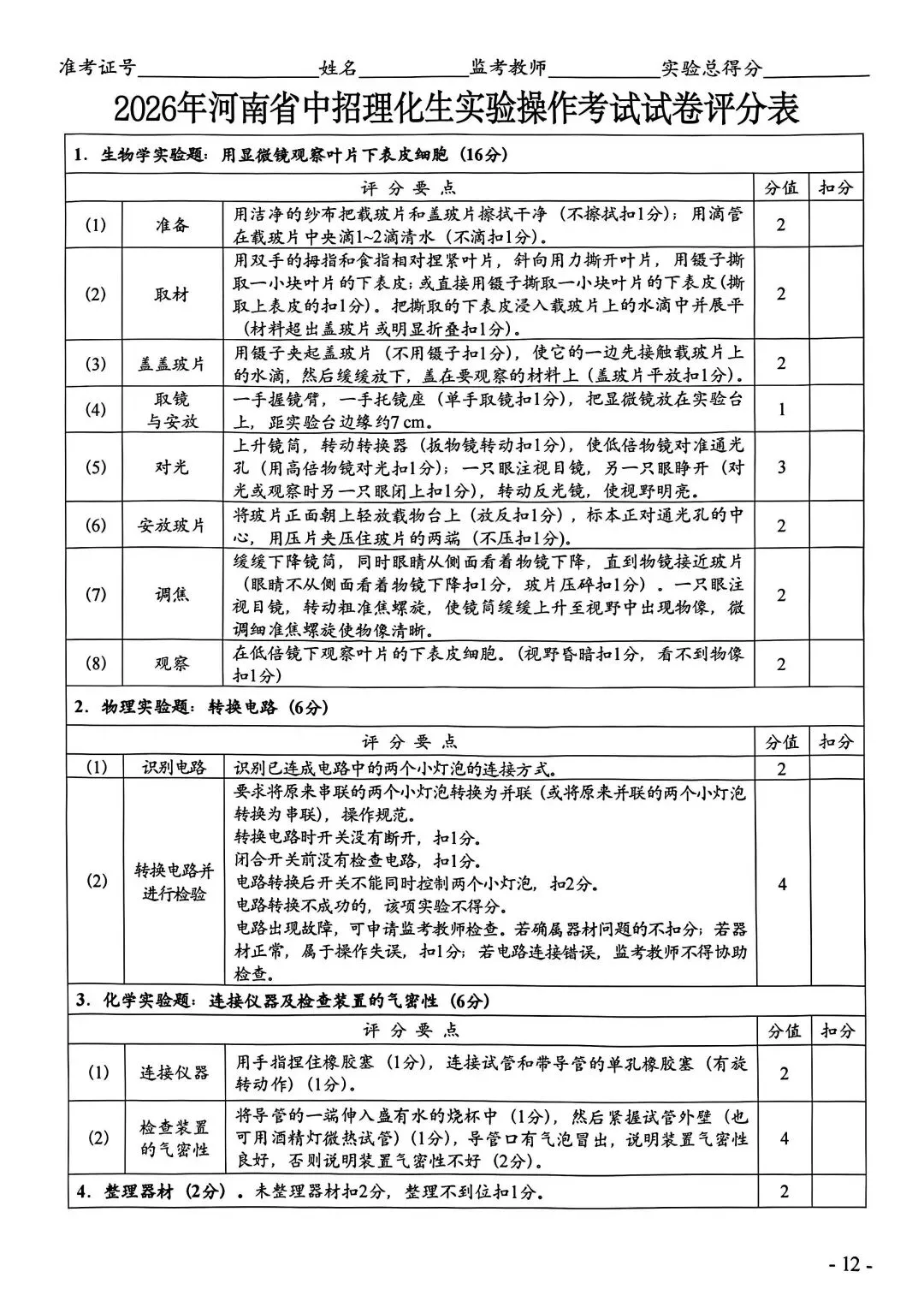 >2026年河南中考实验操作试卷及评分标准CD卷