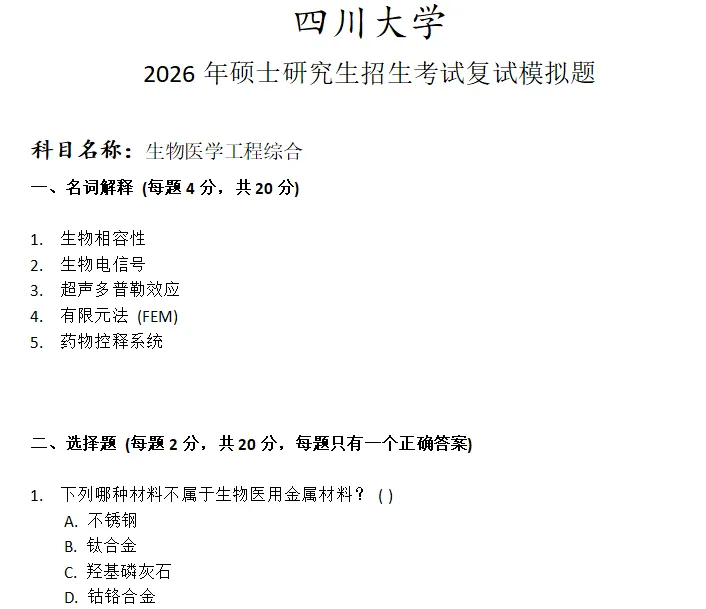 >四川大学生物医学工程综合考研复试真题模拟