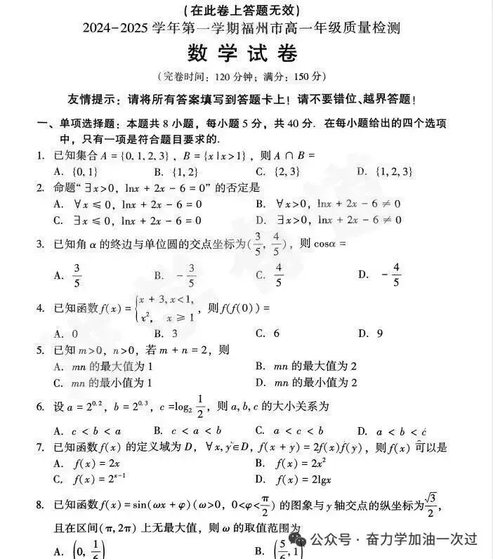 【福州】高一期末试卷汇总(全科)(2024-2025学年)
