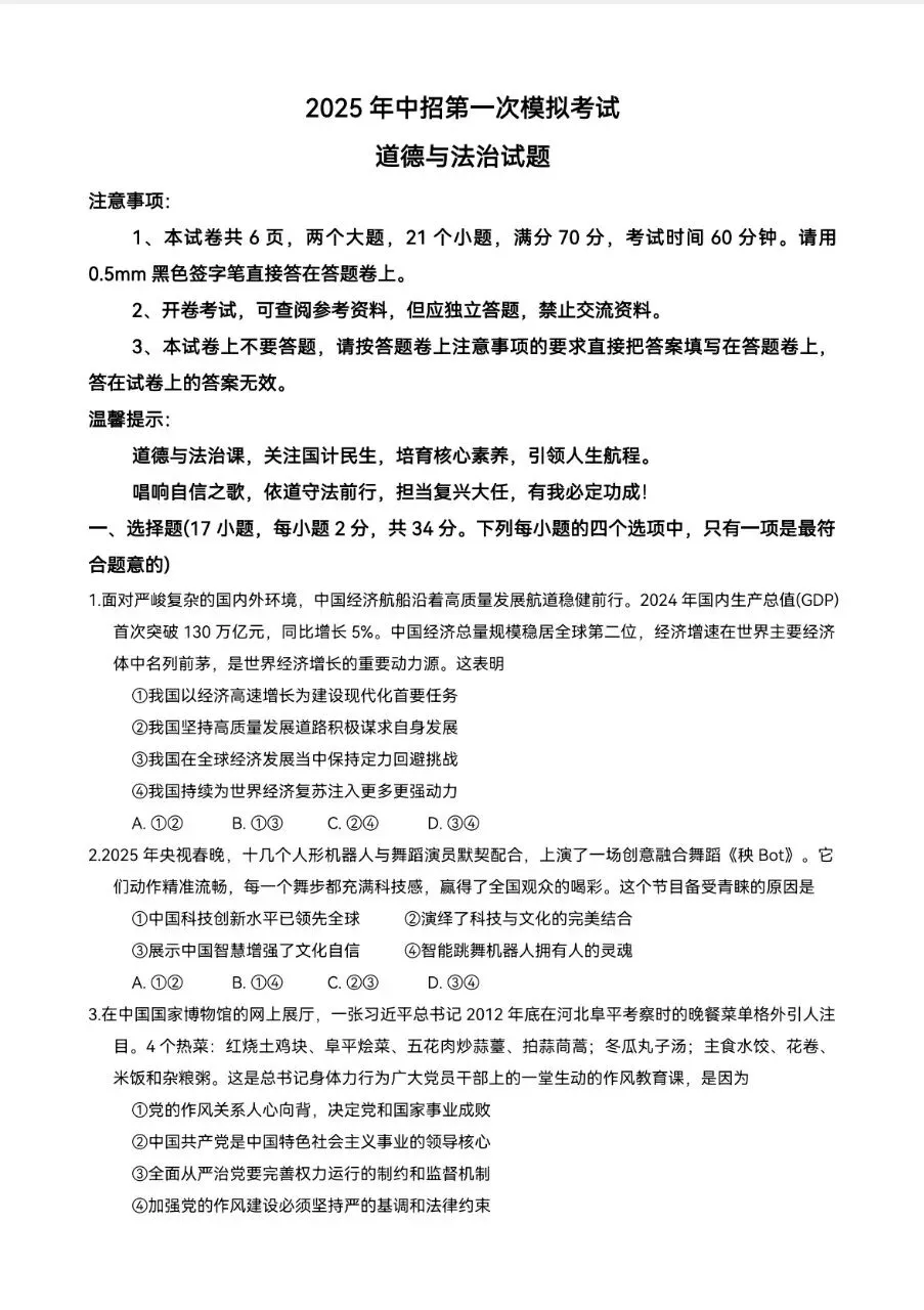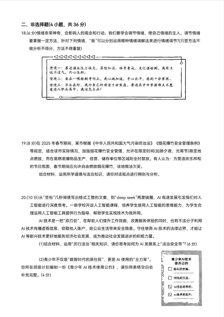 2025年中考一模道法试卷分享(六)