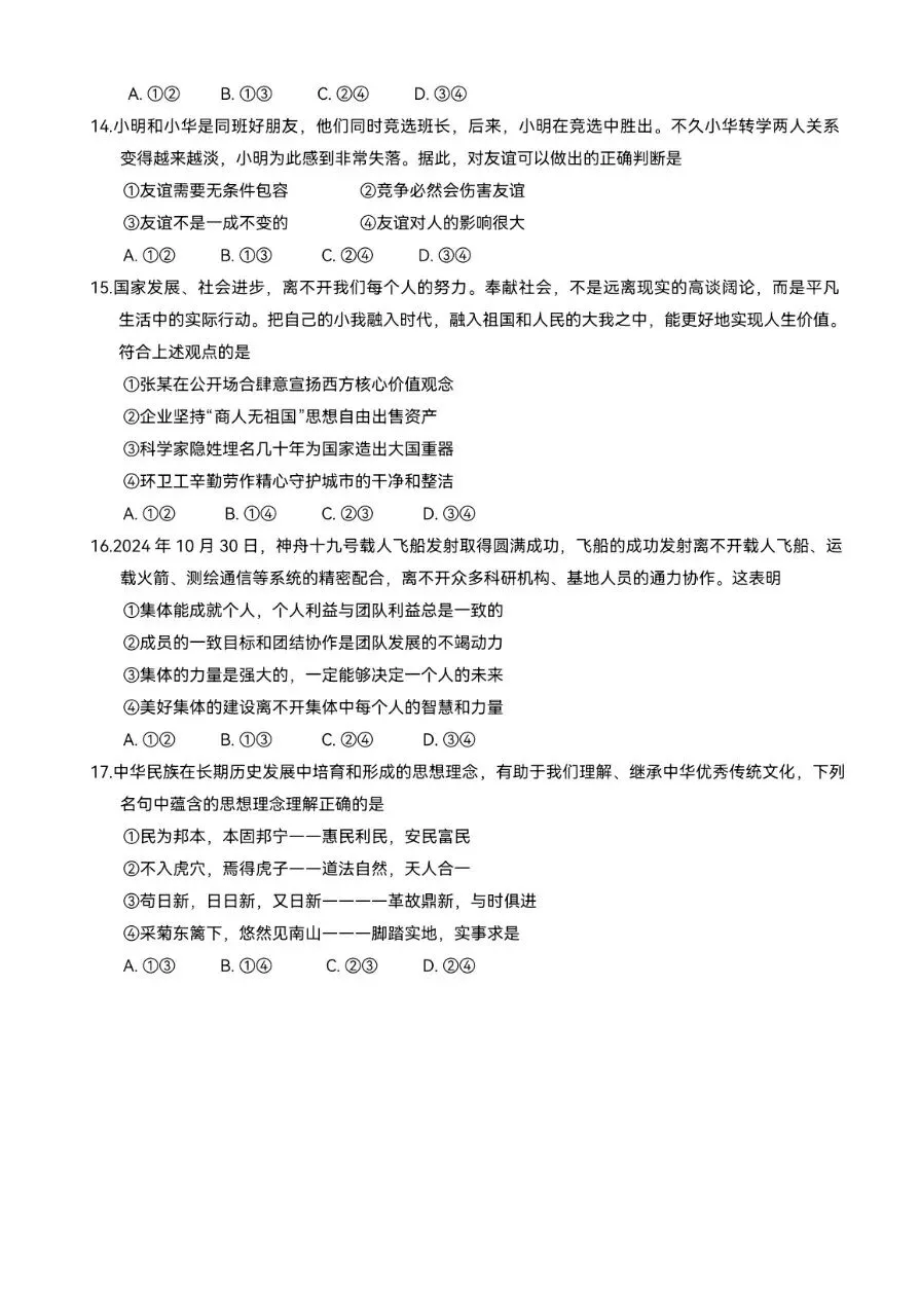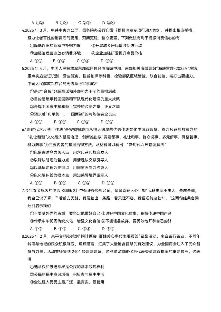 2025年中考一模道法试卷分享(四)