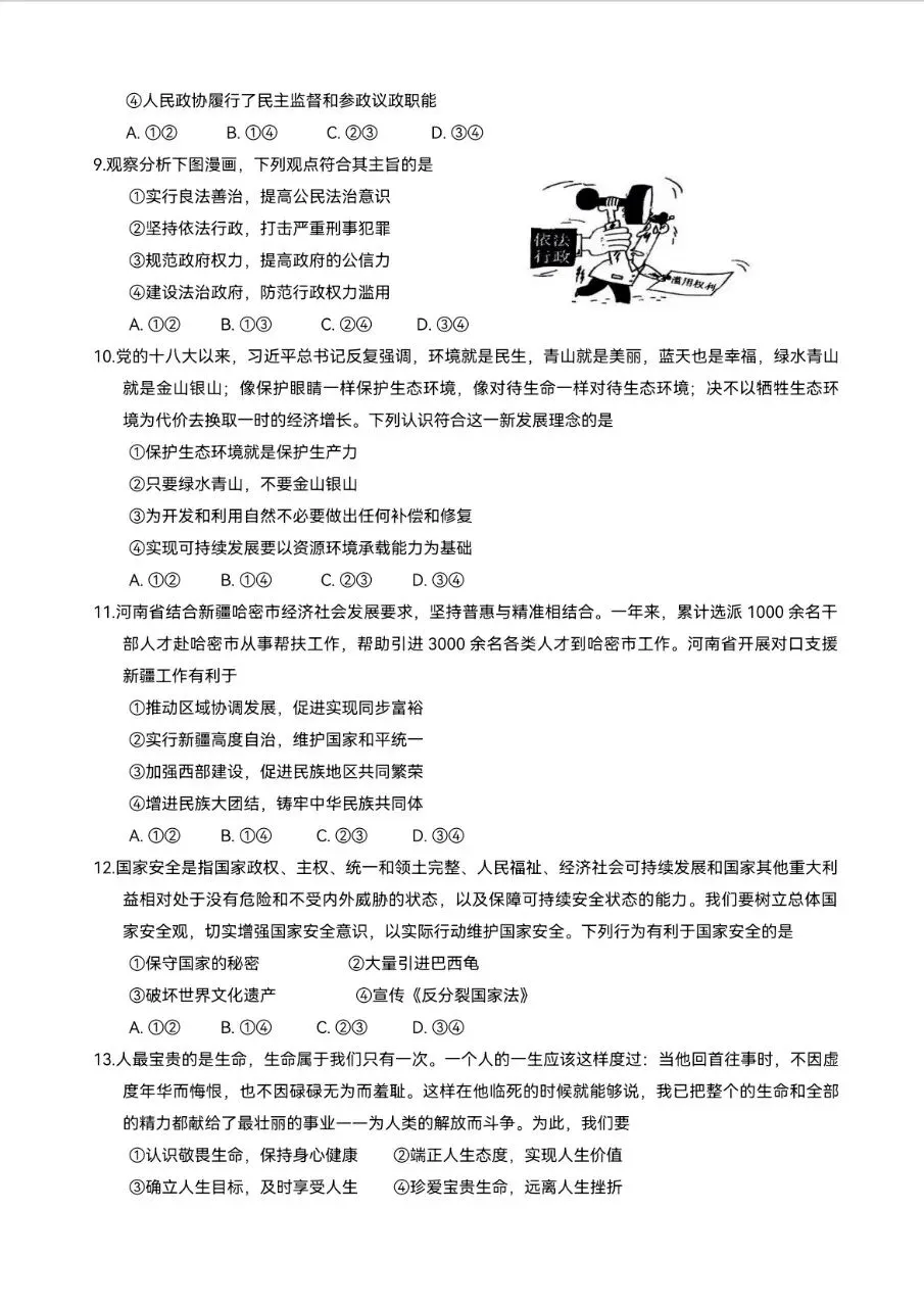 中考道法模拟试题分享(九)