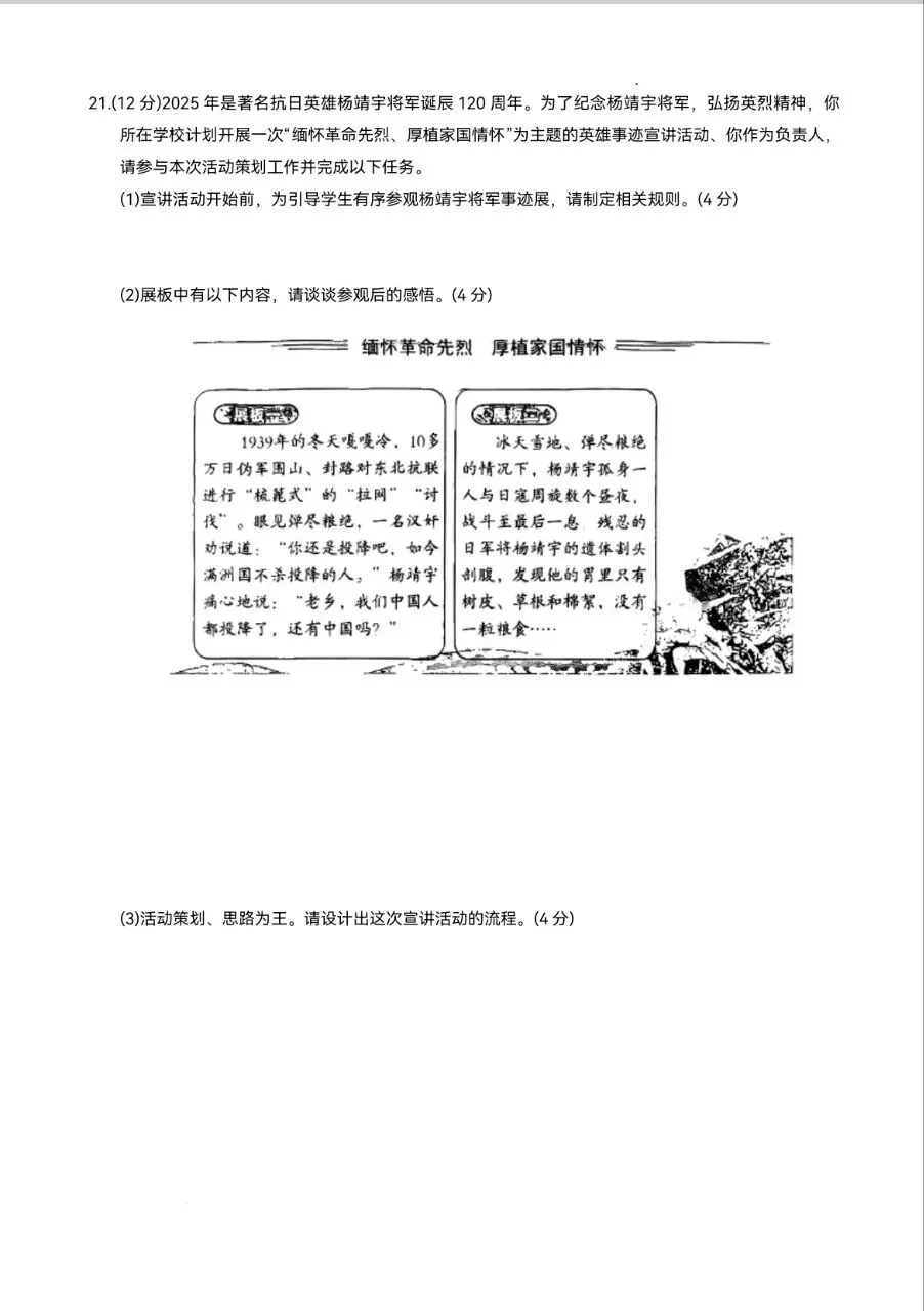 (2)①杨靖宇将军在极端艰难的情况下,依然坚守抗日,展现出了坚定的爱国情怀和英勇无畏的精神,他的事迹让我们深刻认识到今天的幸福生活来之不易,是无数革命先烈用鲜血和生命换来的。②我们要向杨靖宇将军学习,树立远大理想,努力学习科学文化知识,增强自身本领,为实现中华民族伟大复兴贡献自己的力量。(每点2分,共4分)