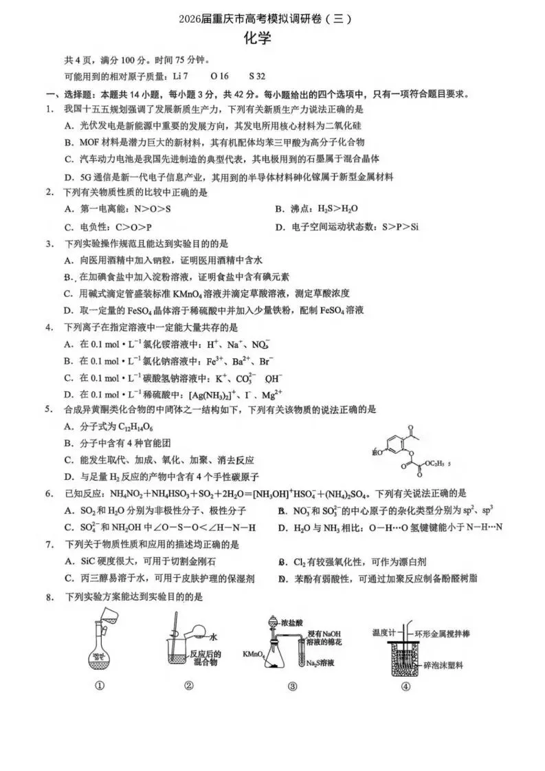 >【高一、高二、高三最新月考试卷】2026届重庆康德教育高考模拟调研(三)化学+答案