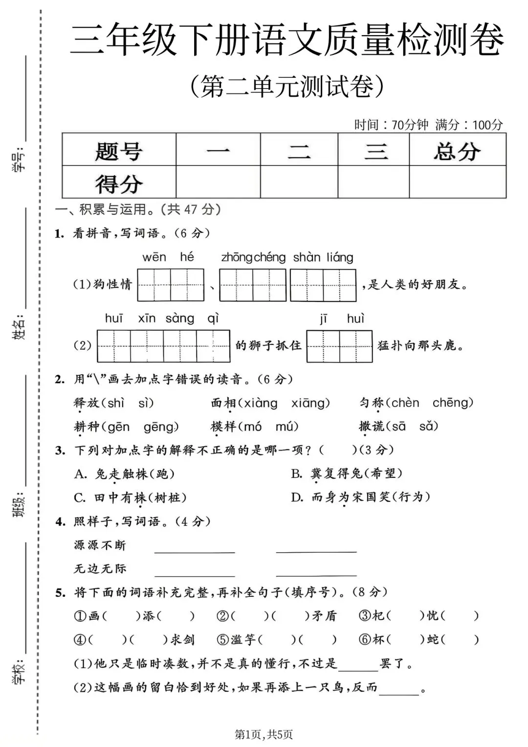 三年级下册人教部编版语文,第二单元检测试卷3套,含答案,电子版可下载打印。这3套试卷紧扣第二单元知识点,含情景卷(带孩子闯关生活情境题),达标卷(检测基础知识),质量卷(巩固重点难点),帮孩子及时查漏补缺吃透考点,再巩固提升,每套均含答案,方便家长批改订正,需要的朋友抓紧领取,让孩子用起来吧💪!