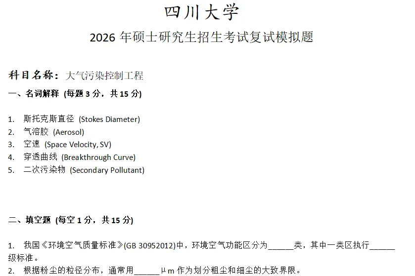 >四川大学大气污染控制工程考研复试真题模拟
