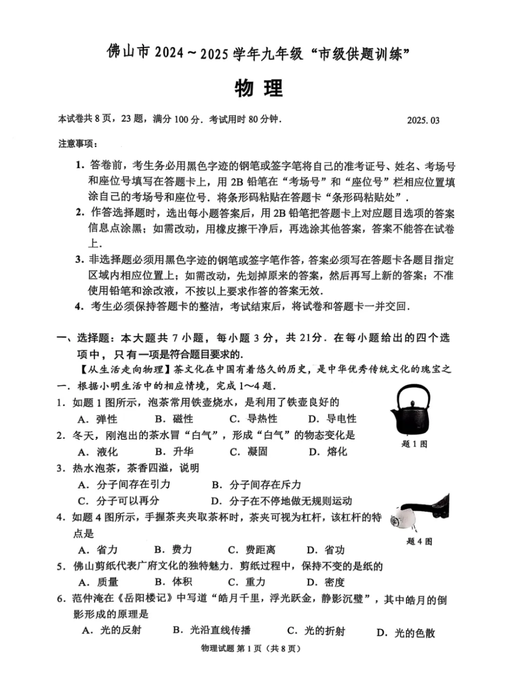 2025佛山市九年级中考第一次摸底考试物理试卷及答案