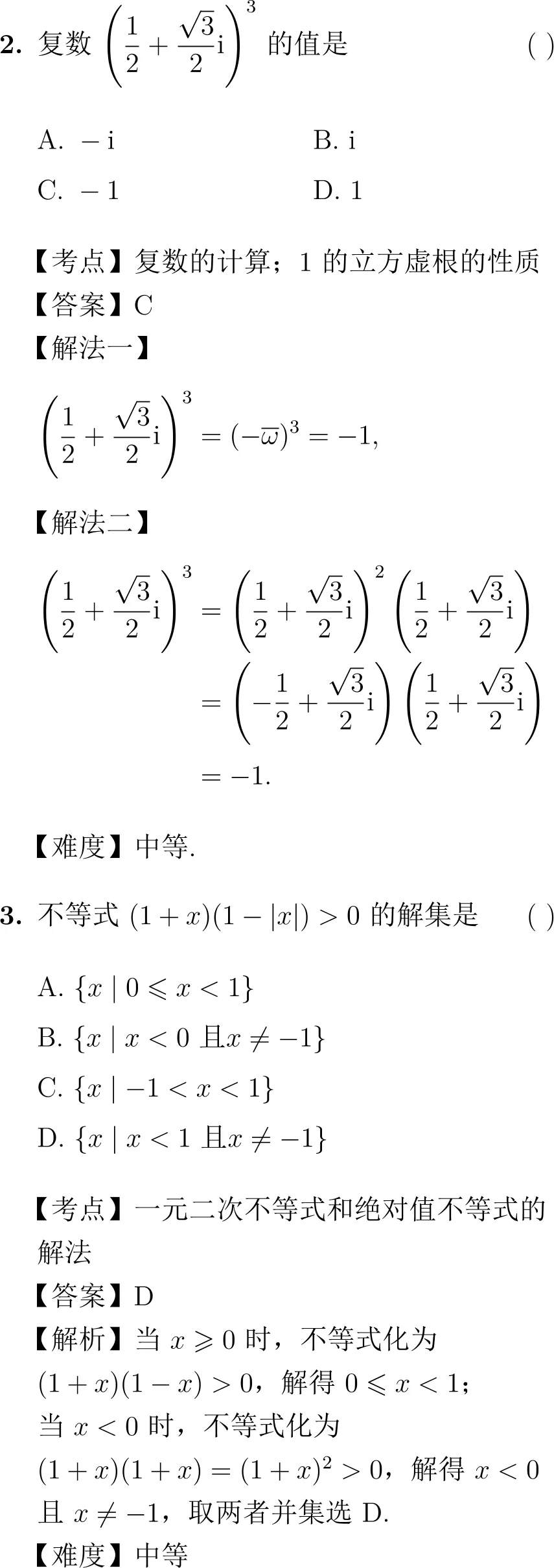考点分布广泛:题目覆盖了圆的方程、复数、不等式、三角函数、集合、解析几何(参数方程)、立体几何(圆锥、半球、棱柱)、函数性质(单调性、图像)、排列组合、数列(等比数列)等多个核心模块。