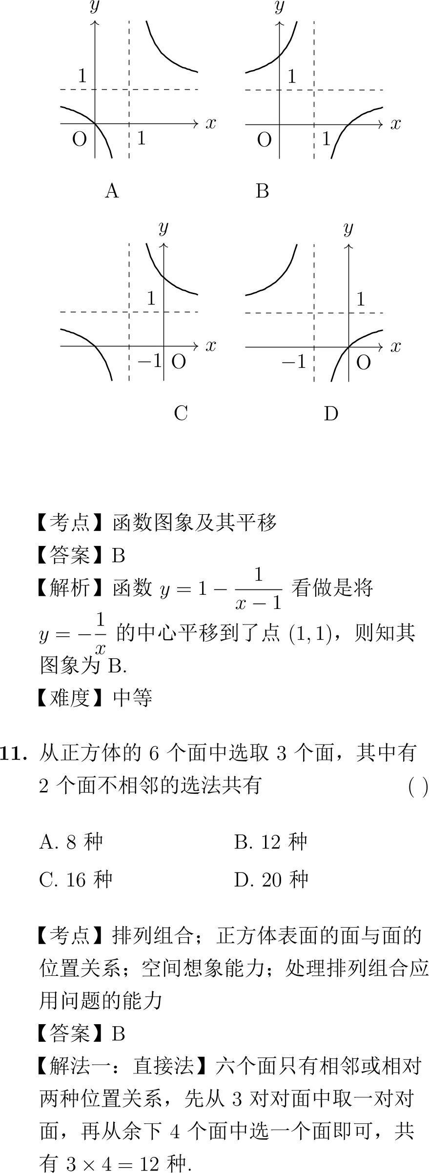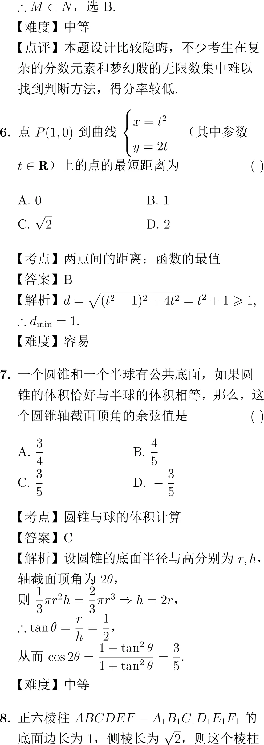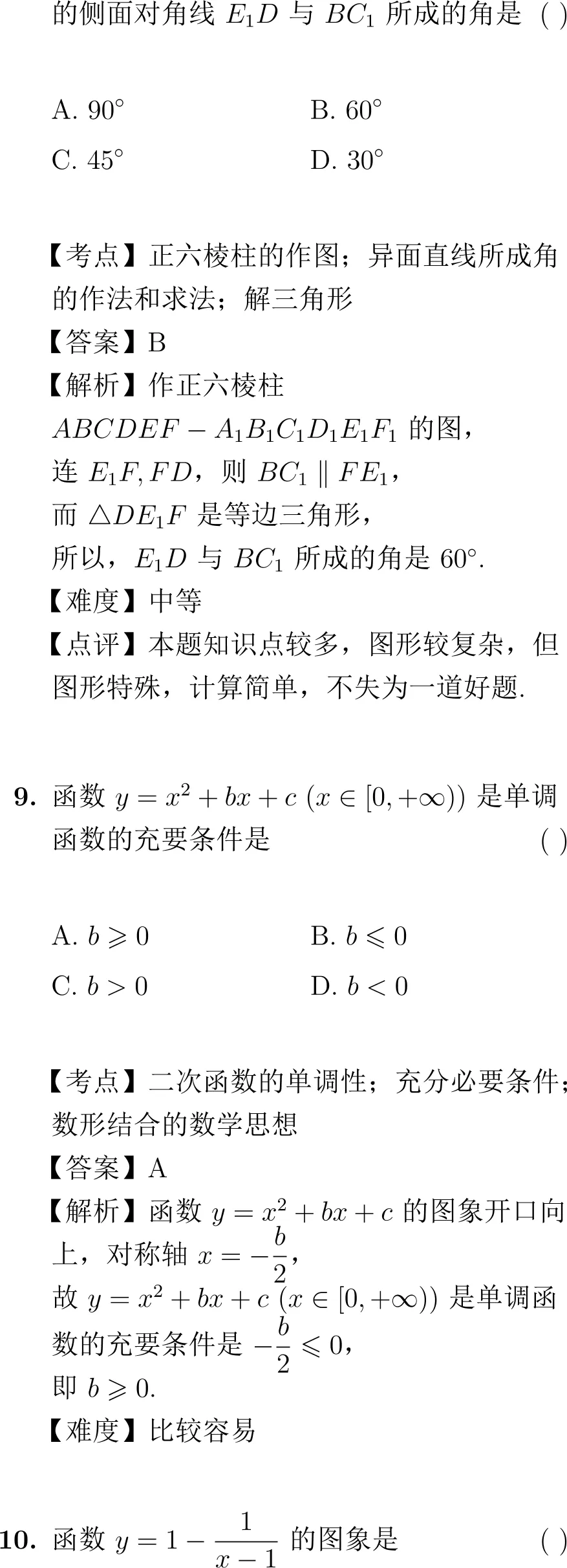 第8题(立体几何):考查正六棱柱中异面直线所成的角,需要较强的空间想象能力和作图能力,知识点较多但计算简单,是一道好题。