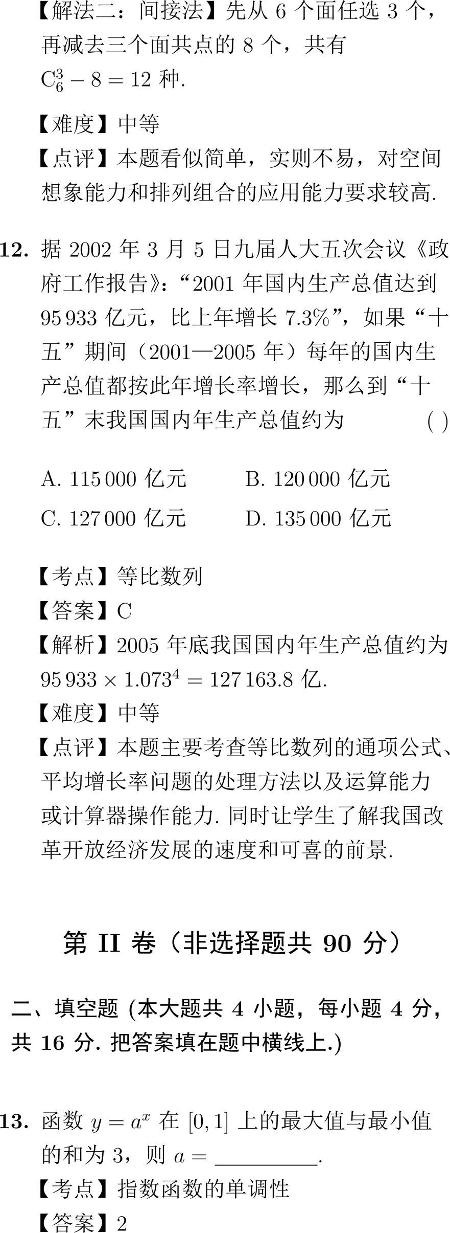 第12题(应用题):以国民经济为背景,考查等比数列的应用,具有时代特色,同时锻炼了学生的运算能力。