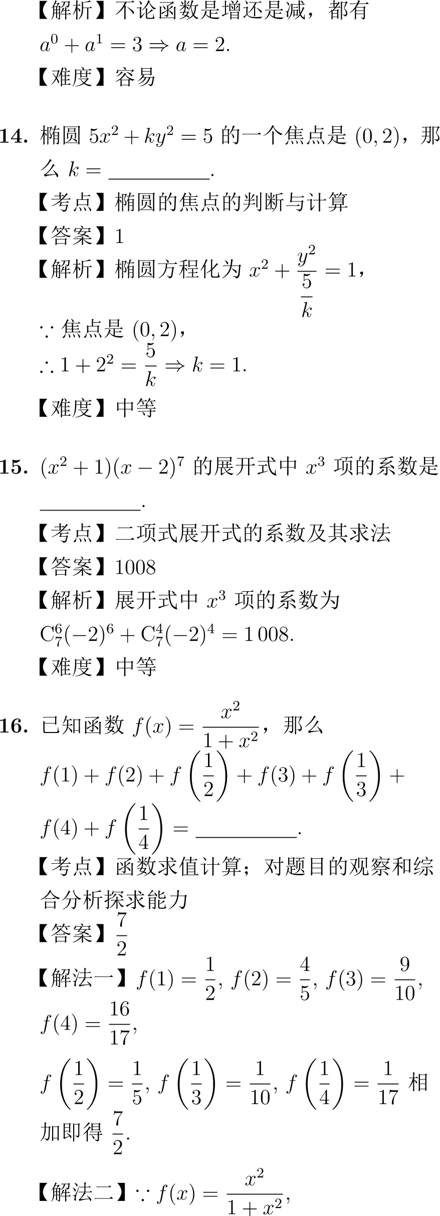第14题(椭圆):考查椭圆标准方程和焦点坐标的计算,属于常规题型。