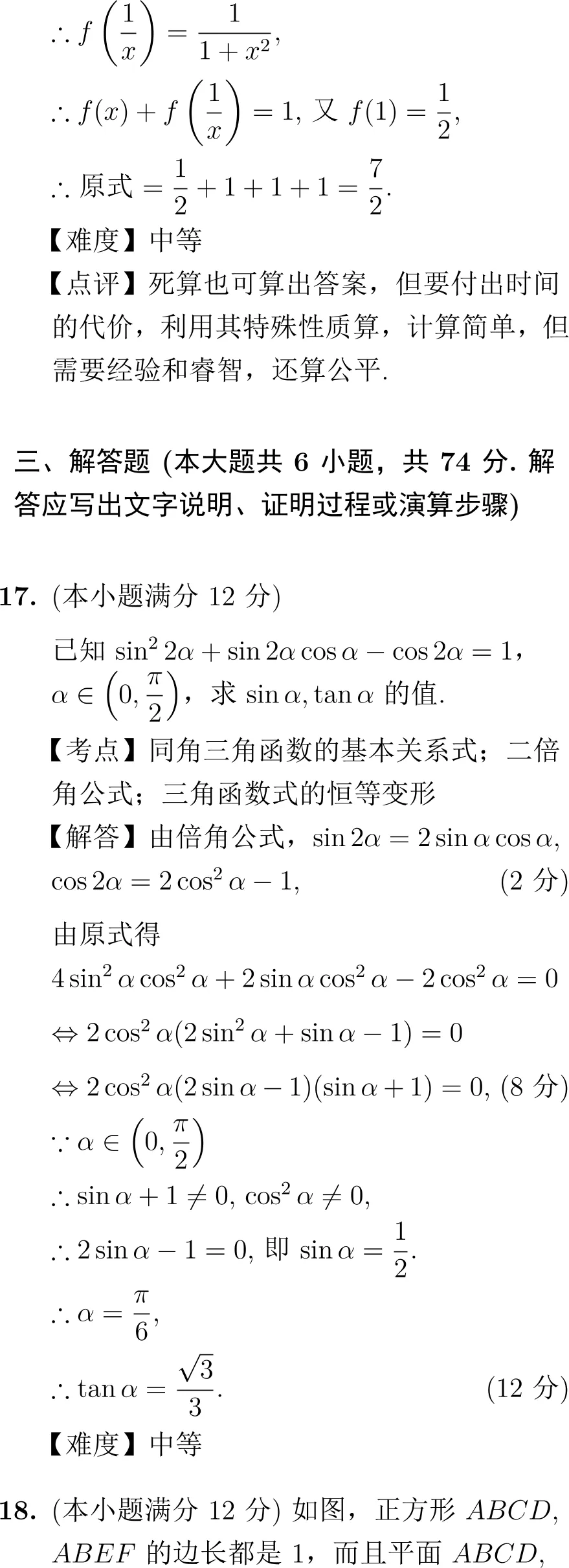 第16题(函数求值):这是一道亮点题。直接代入计算繁琐,但若能发现f(x)+f(1/x)=1的性质,则可快速求解。点评指出此题“需要经验和睿智”,很好地体现了对观察力和综合分析能力的考查。