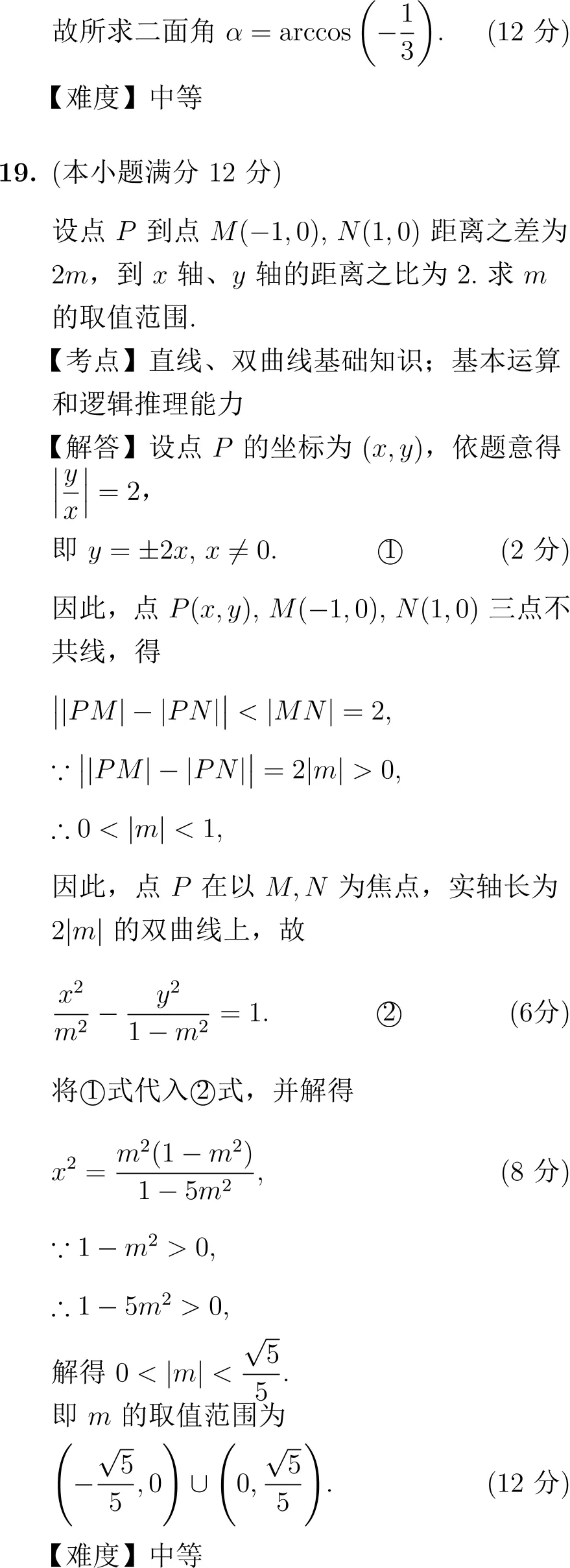 第19题(解析几何):考查双曲线的定义、轨迹方程以及不等式的求解。