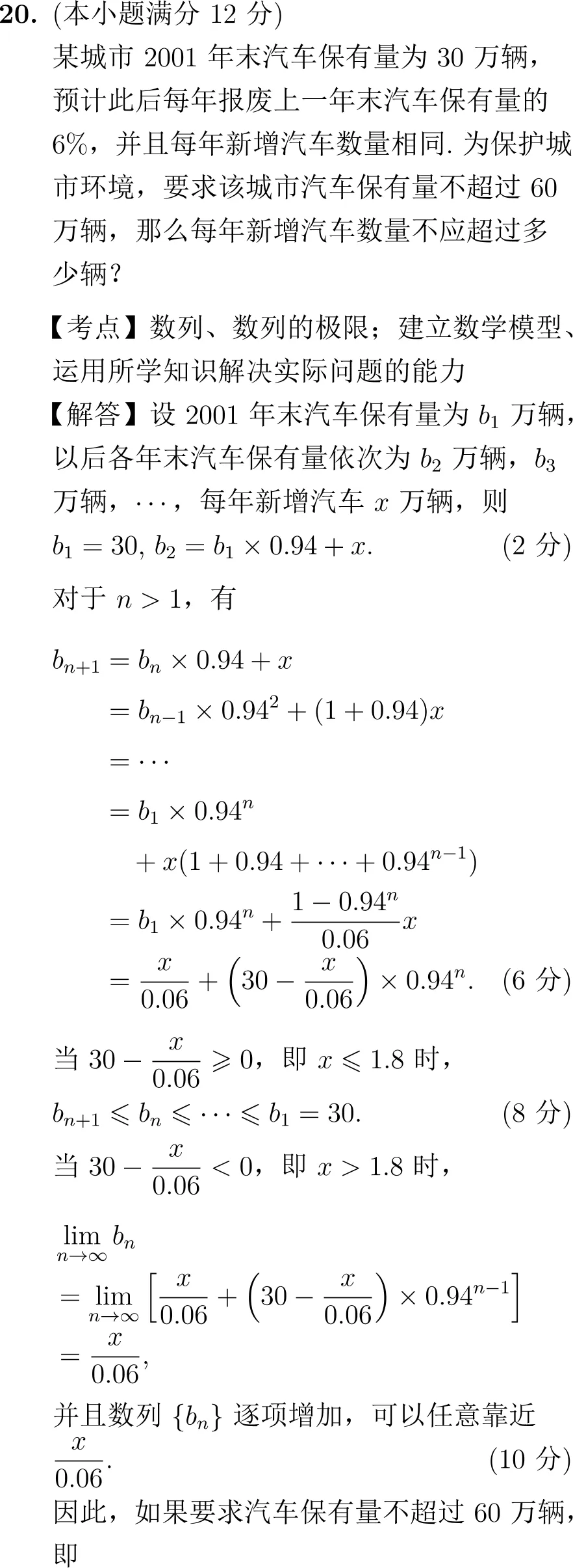 第20题(数列应用题):以汽车保有量为背景,考查数列的递推关系、通项公式、极限以及不等式的应用。