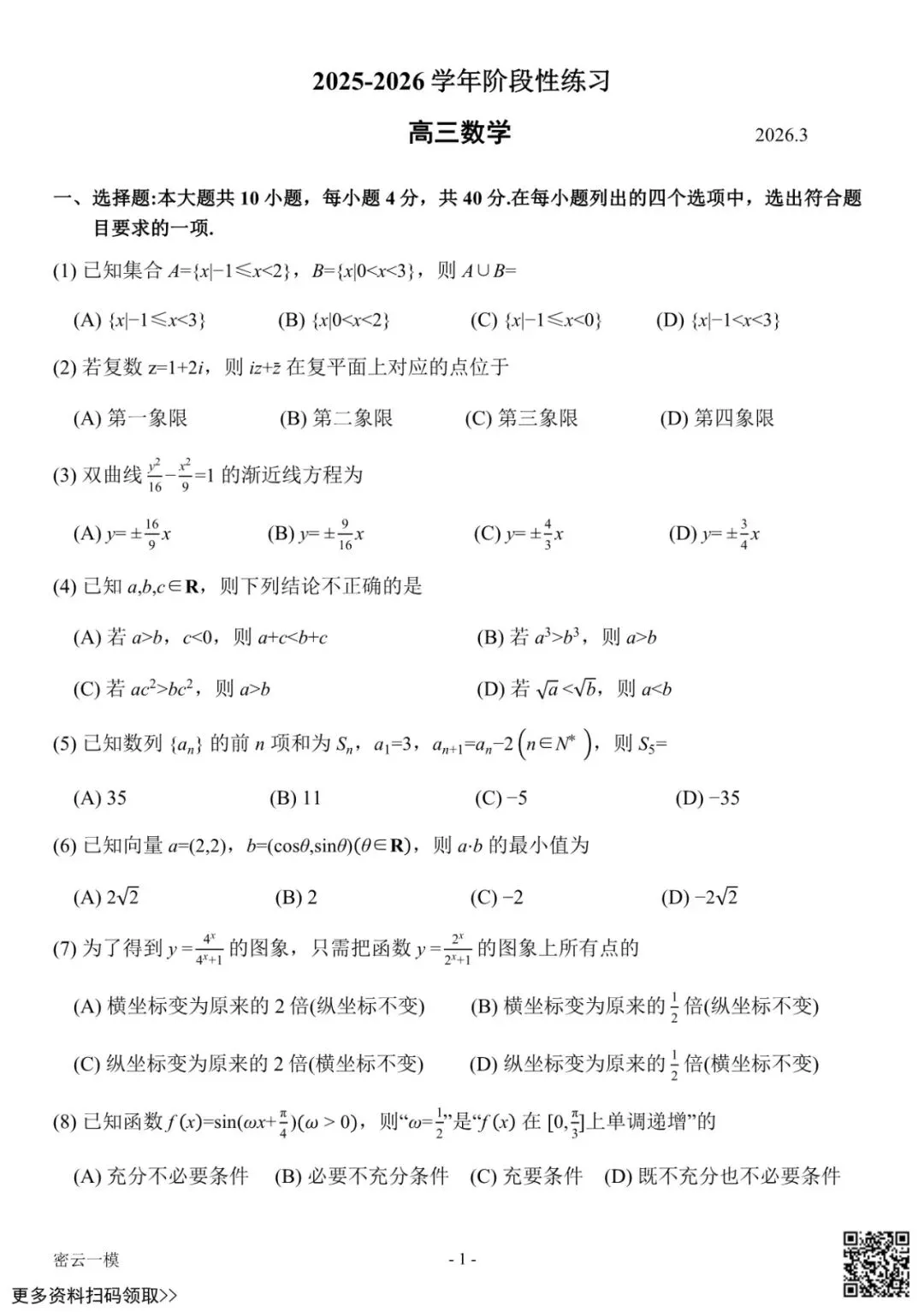 今天给大家分享的是2026北京密云高三一模数学试卷(含答案),其他区域或学校的学生都可以练一练。近期会持续分享,欢迎大家多多关注,也可以把我们分享给更多人哦。