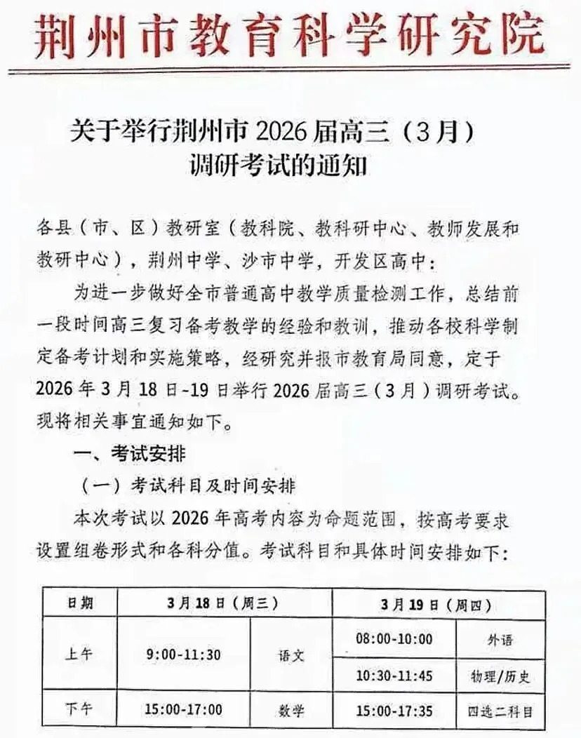 当前位置:首页>考研真题>【试卷+答案】3月18日湖北荆州市2026届高三3月质量检测(荆州二调)全科汇总!